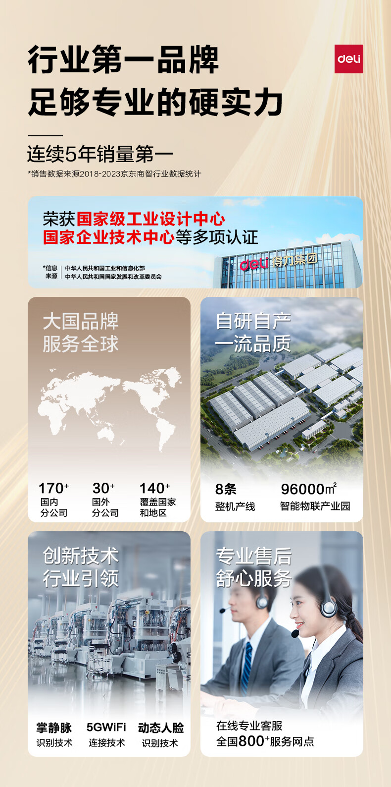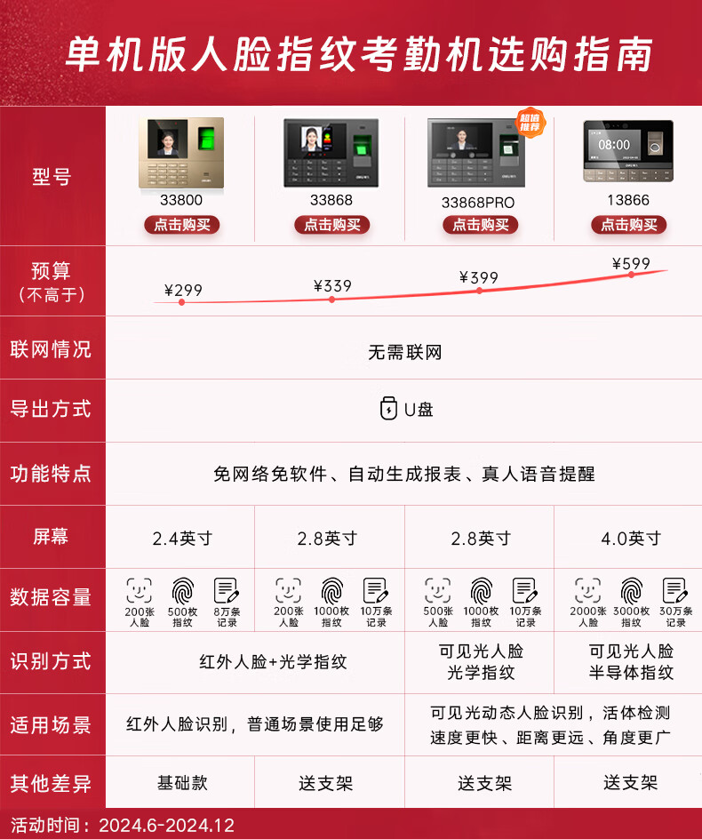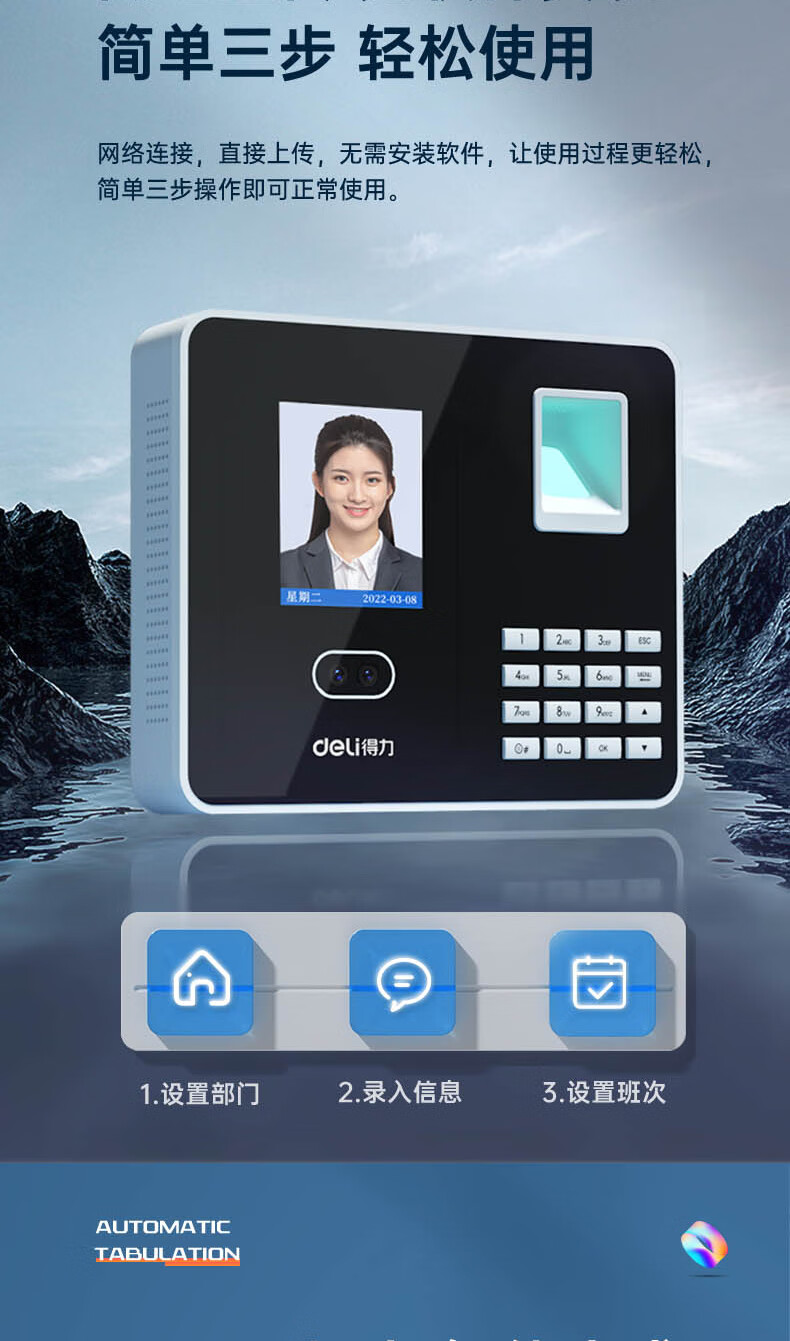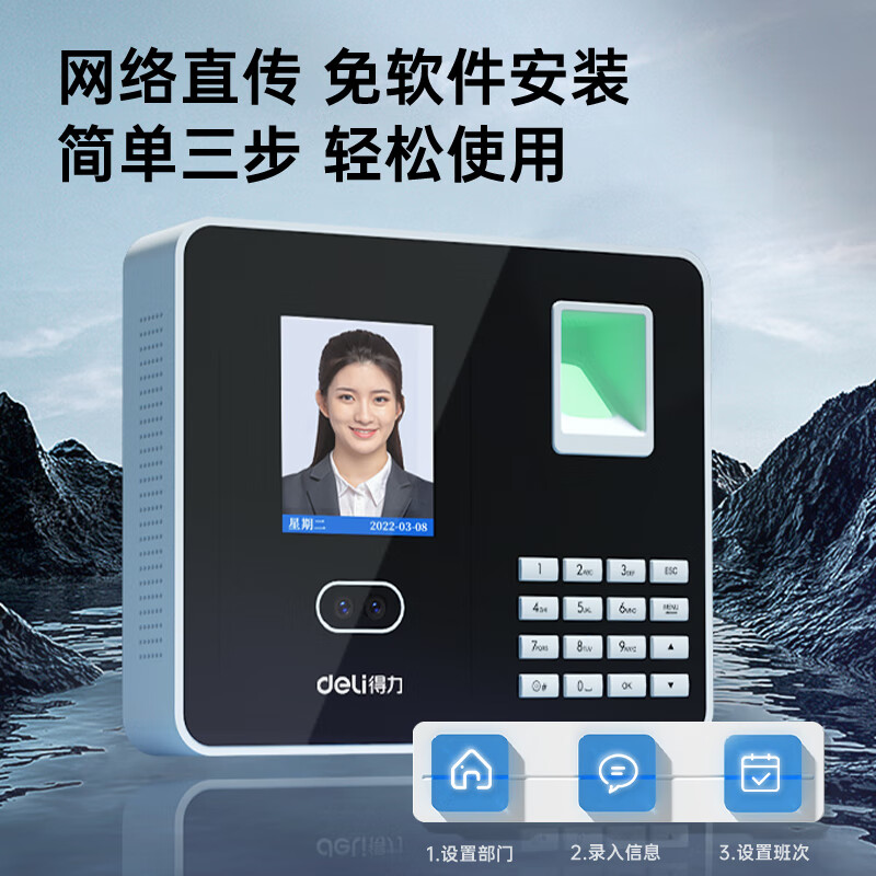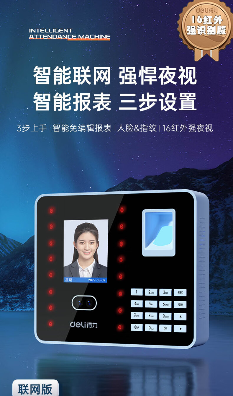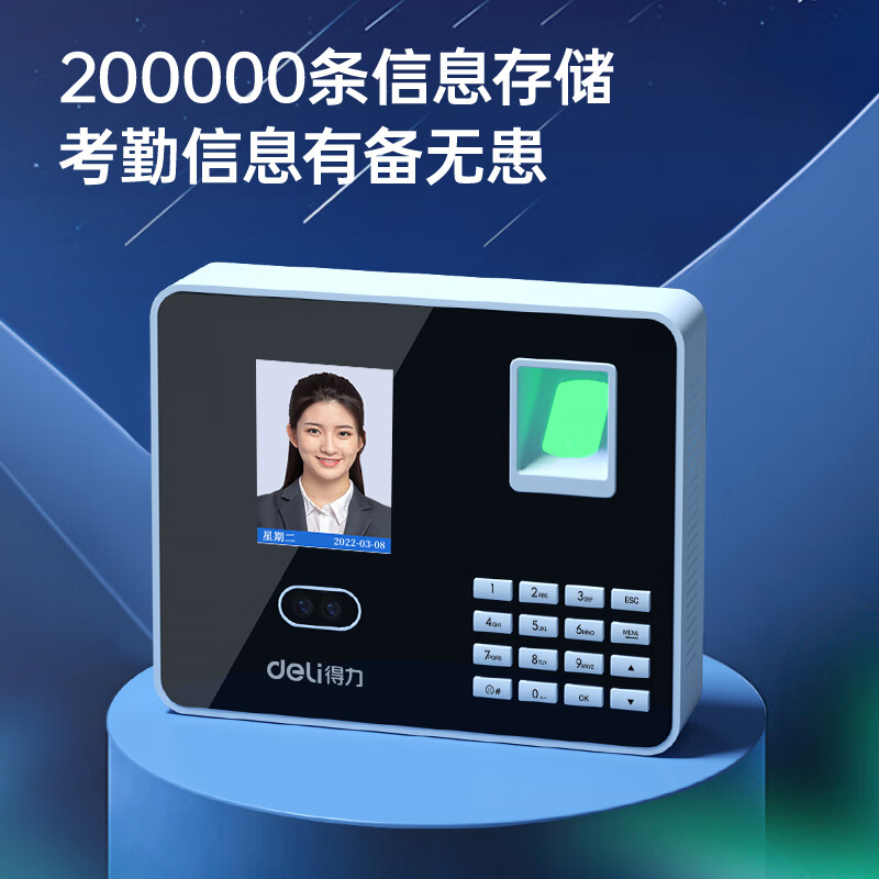 > 得力(deli)人脸+指纹考勤机 红外夜视 快速识别 无接触打卡考勤 双考勤模式 支持局域网 自动生成报表3969