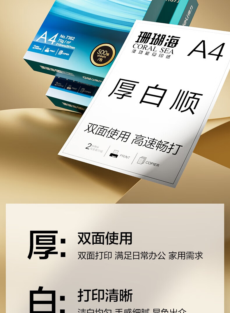 得力(deli)珊瑚海A4打印纸 70g500张*5包一箱 双面打印复印纸 企业采购优选 5箱囤货装7361【销冠系列】