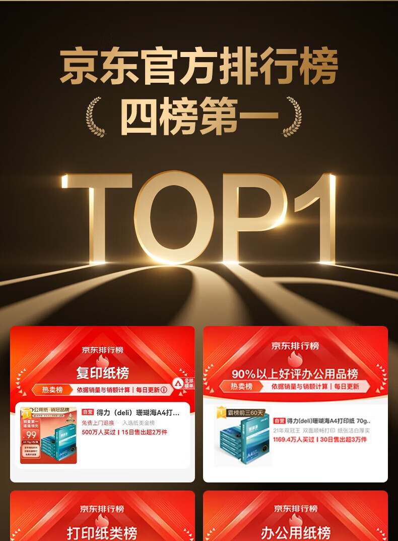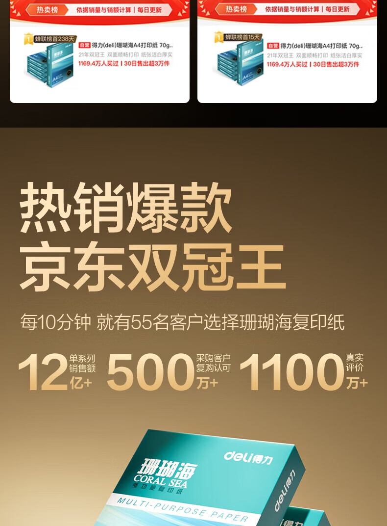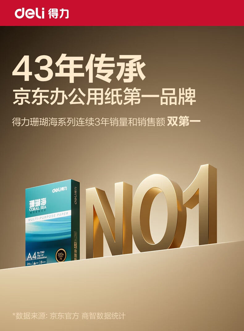 > 得力(deli)珊瑚海A4打印纸 70g500张*5包一箱 双面打印复印纸 企业采购优选 5箱囤货装7361【销冠系列】