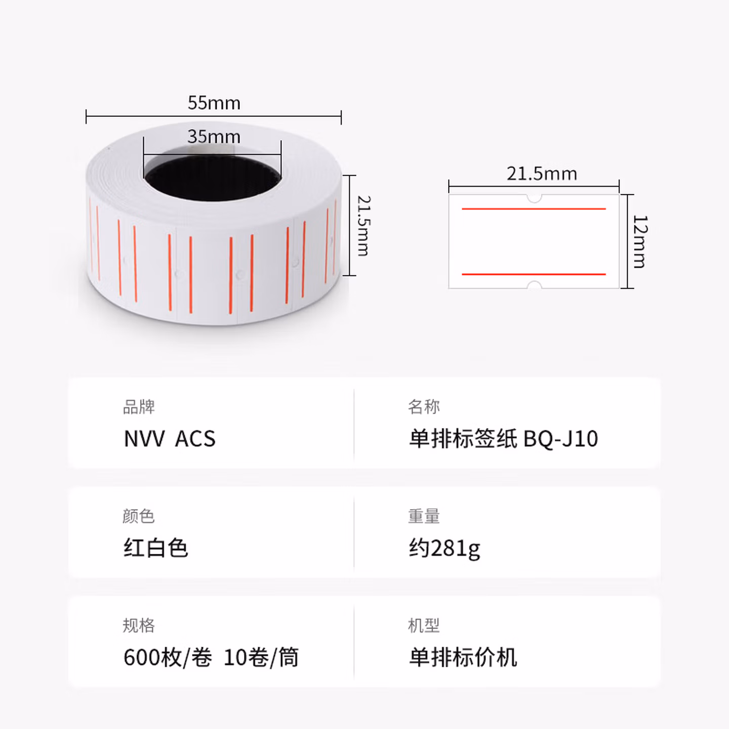 NVV 价格标签 标价贴纸 打码机 打价纸 通用单排标价纸21.5*12mm 10卷/筒 600张/卷 BQ-J10