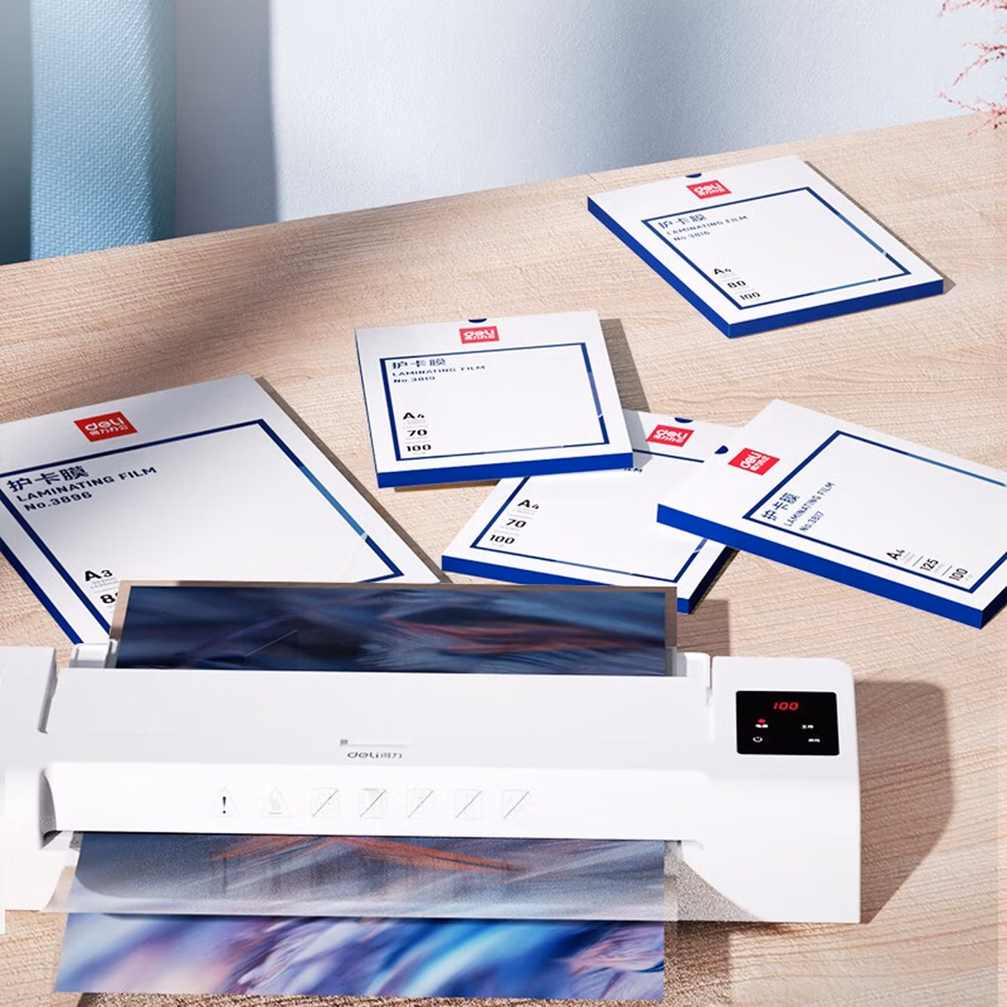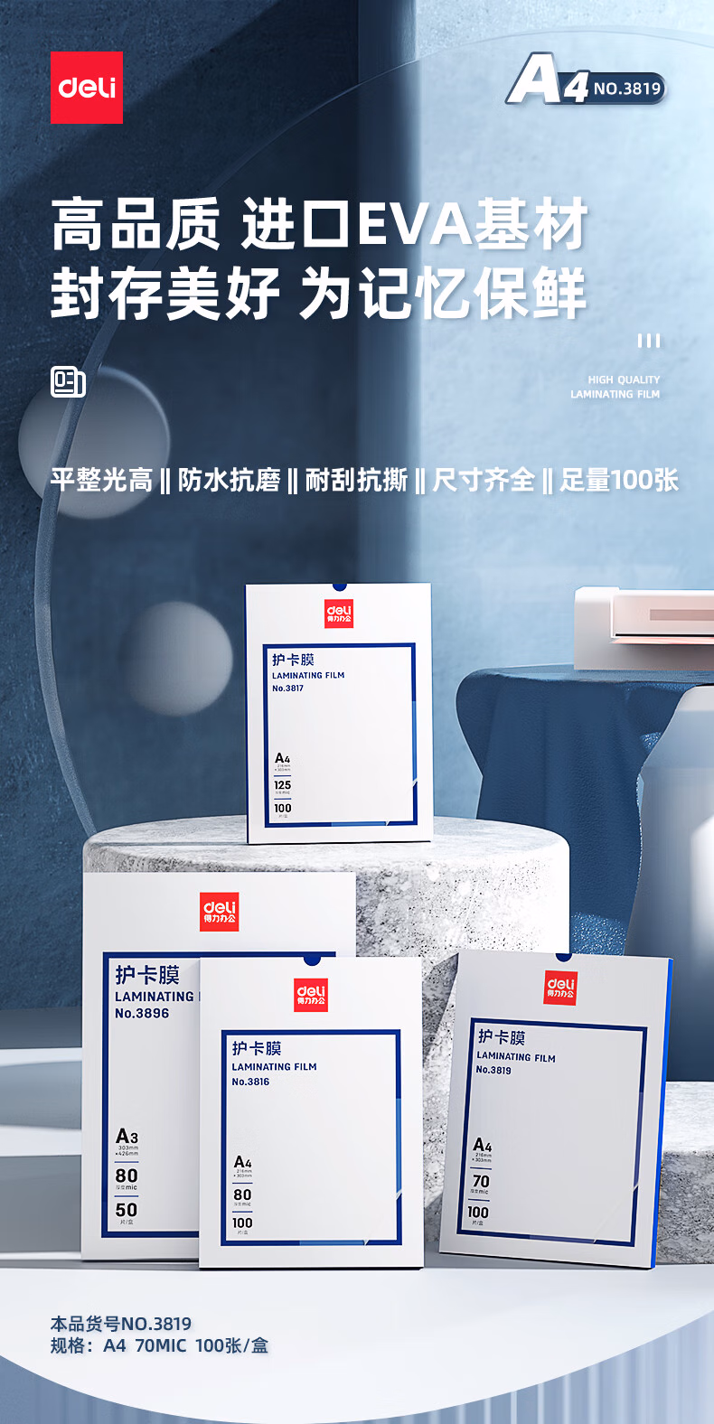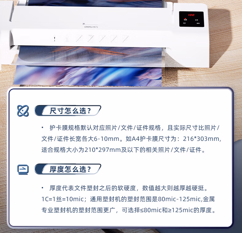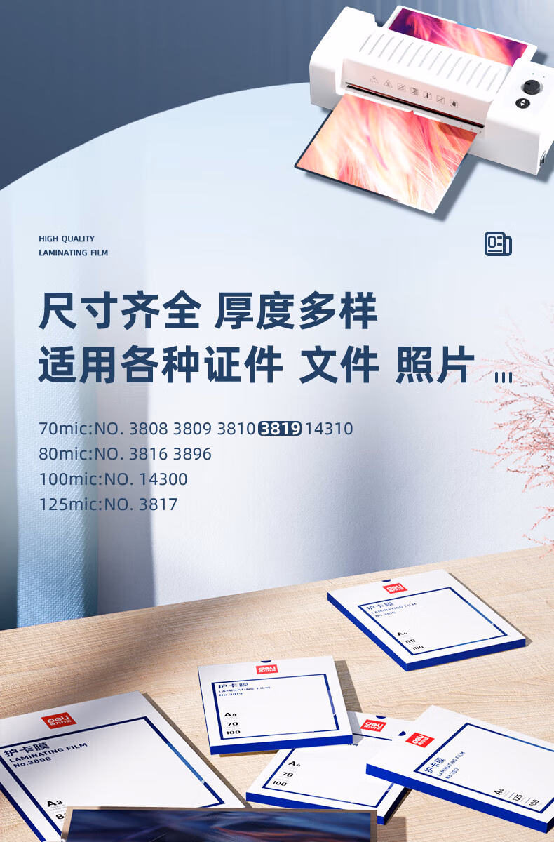 > 得力(deli) 3808 过塑机塑封机膜过塑膜 优质专用护卡膜/塑封膜65*95mm 70mic 3寸 100张/包