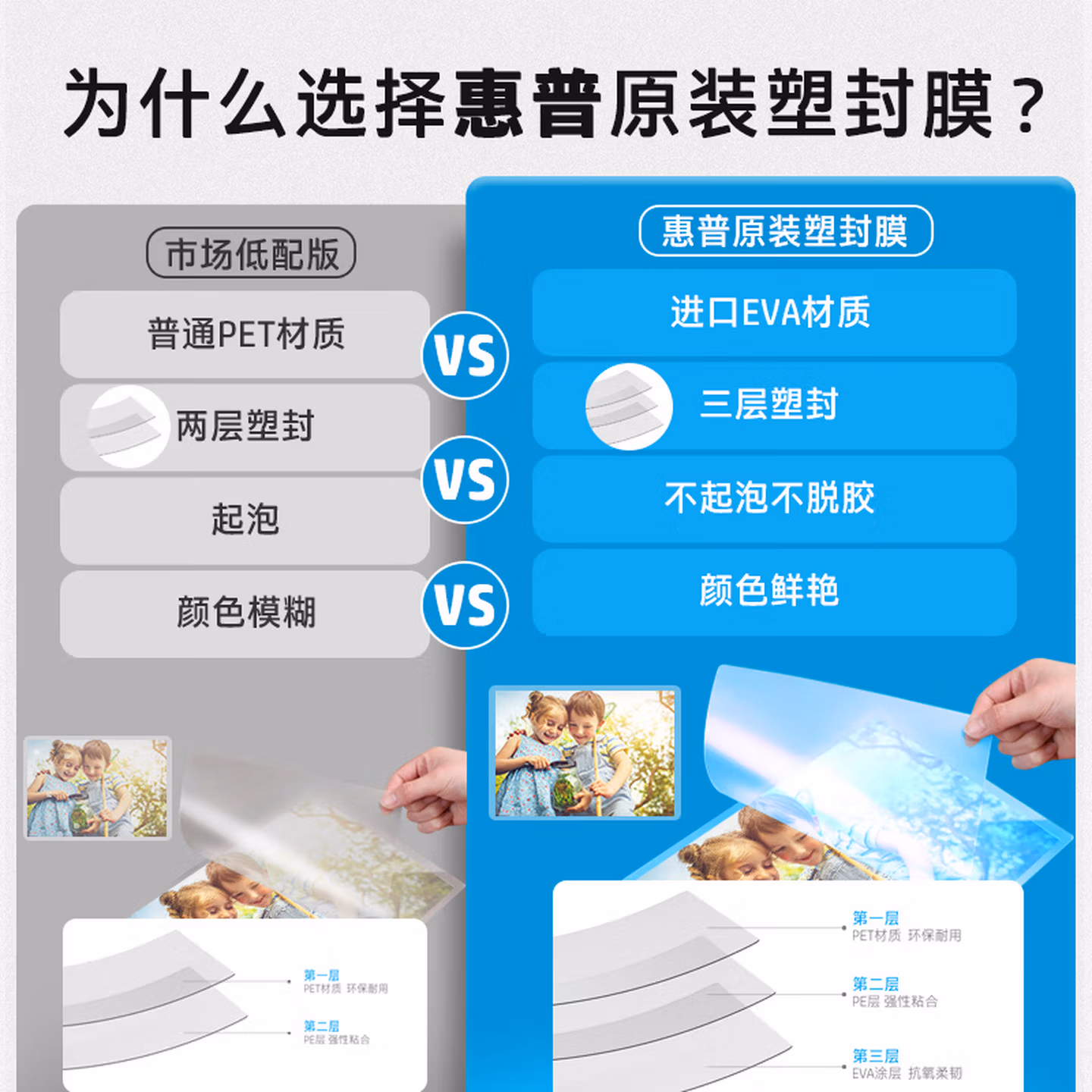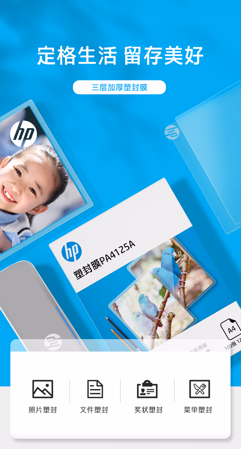 > HP惠普 A3\A4三层加厚塑封膜 优质高透护卡膜/过胶膜 3寸\5寸\6寸\7寸照片文件过塑膜 过塑膜 A4 125mic 100张