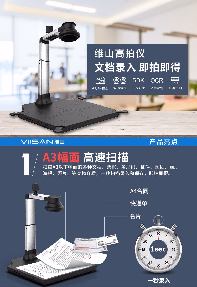 > 维山 高拍仪500万/1000万1700万 像素 A3/A4幅面集成高速智能 扫描仪 500万像素