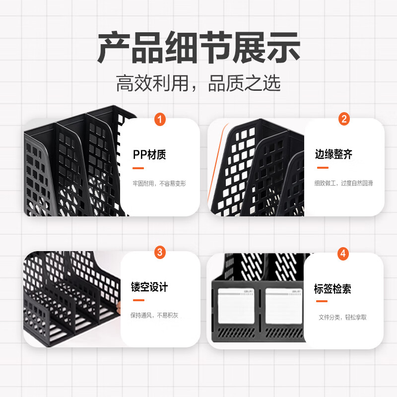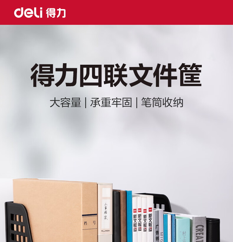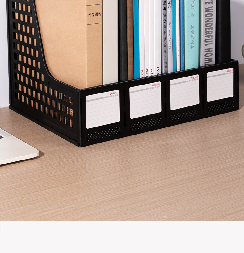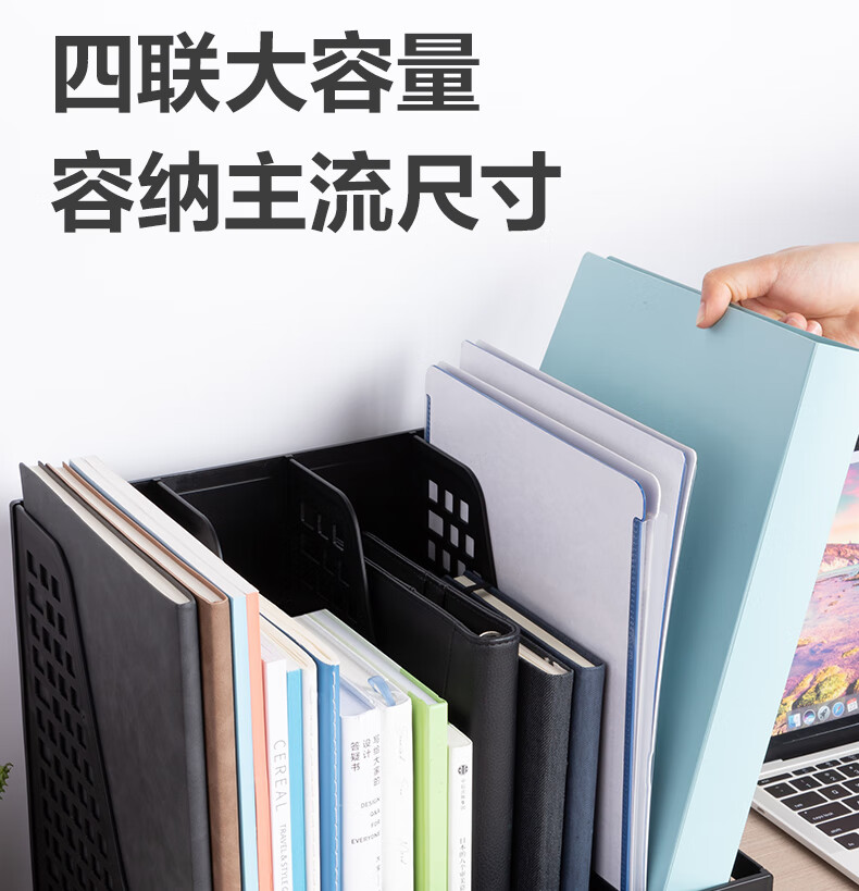 > 得力(deli)4联桌面文件框栏书立架档案收纳盒办公用品资料置物架书本收纳神器黑色