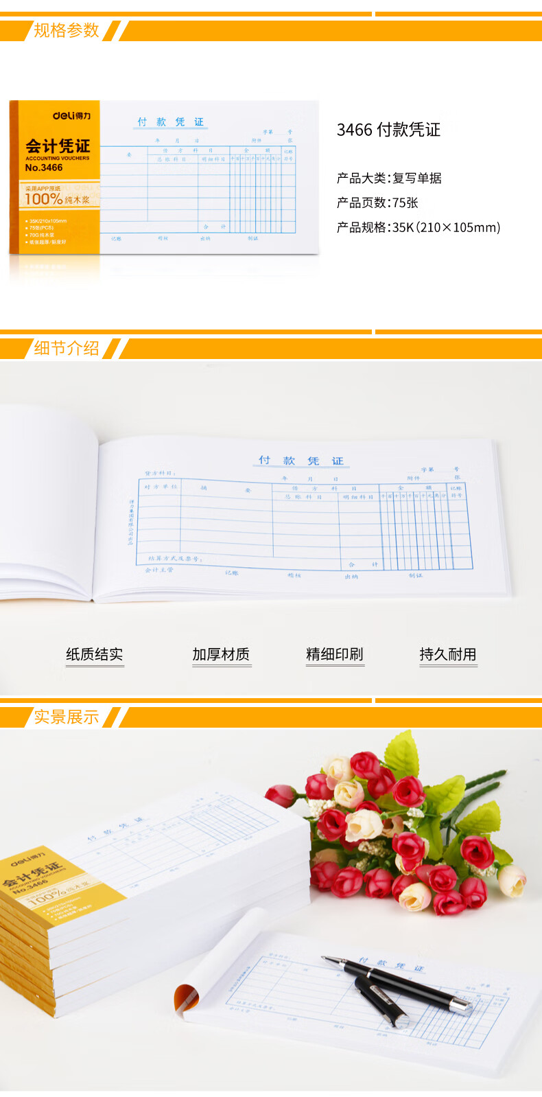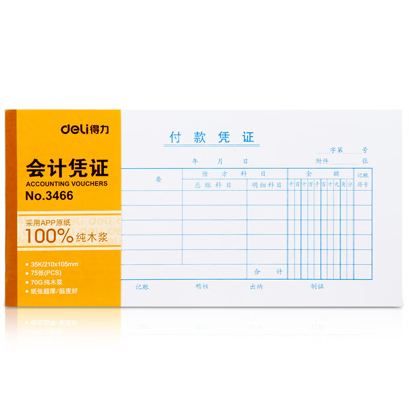 > 得力(deli)十本装35K付款凭证 75张/本210*105mm 记账凭证单据票据 通用空白凭证纸 办公用品 3466