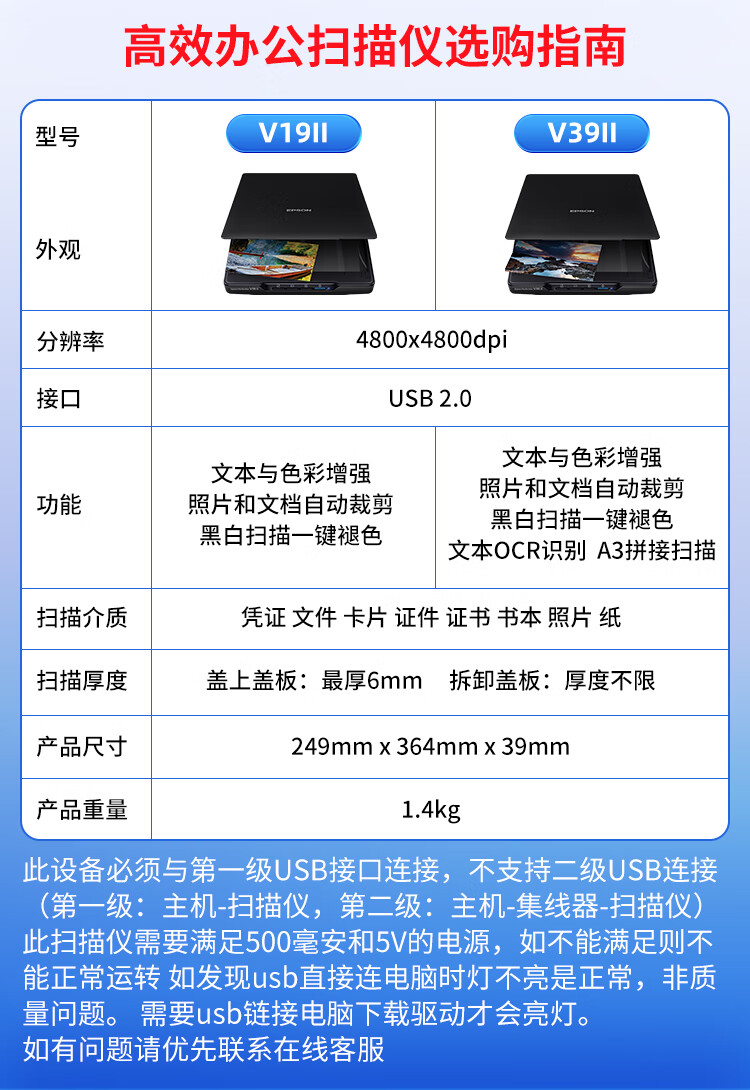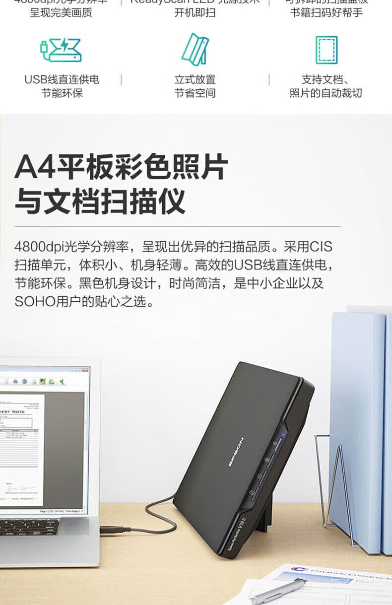 > 爱普生(EPSON)V19II/V39II扫描仪平板式A4彩色高清照片影像实物扫描仪 V19II(A4+USB供电)