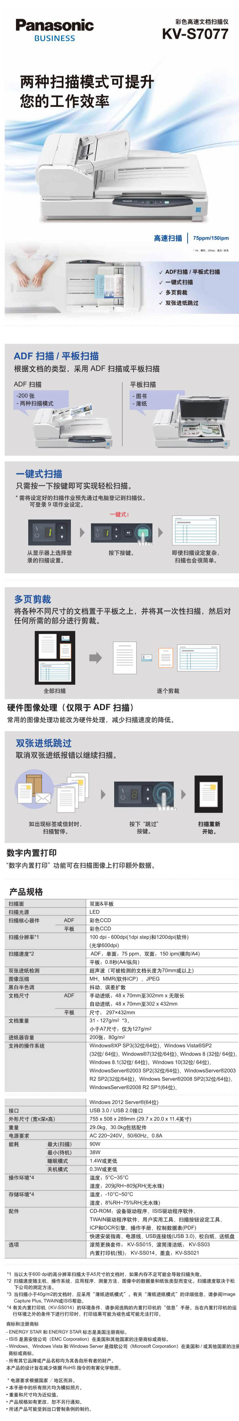 > 松下 KV-S7077 A3高速双面彩色文档扫描仪 自动馈纸 平板75PPM
