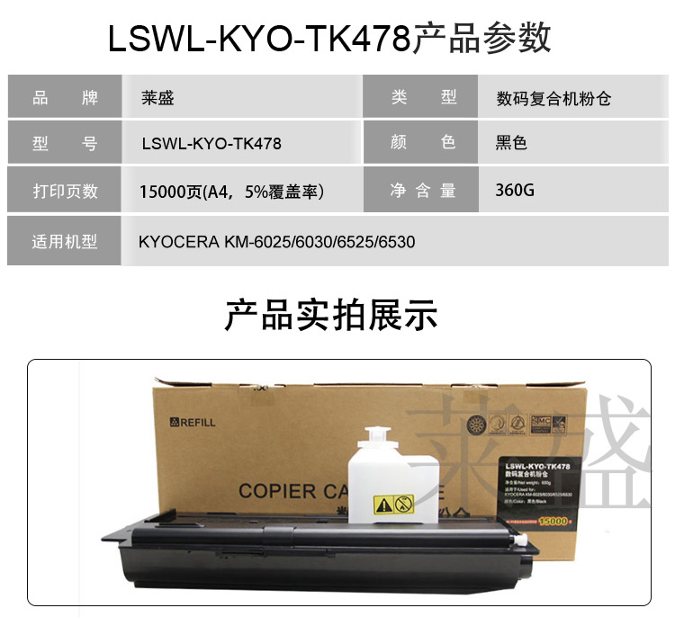 莱盛 LSWL-KYO-TK478数码复合机粉盒复印机粉仓(适用于KYOCERA KM-6025/6030/6525/6530)