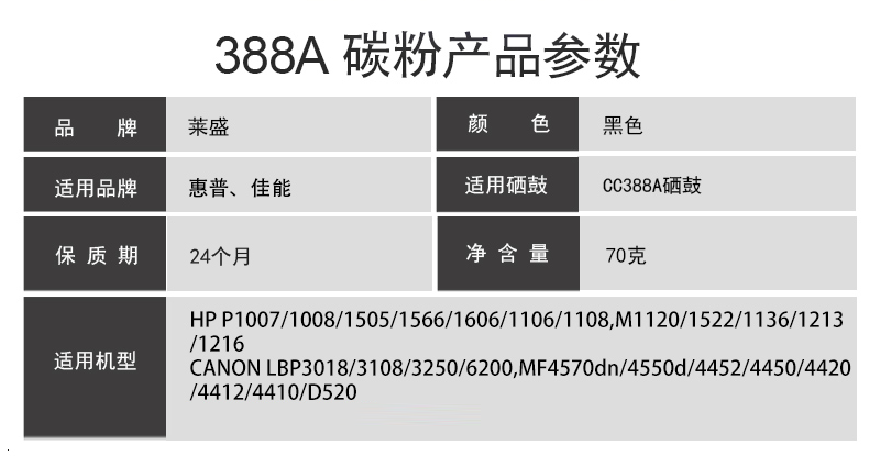 > 莱盛(laser)388A黑瓶碳粉70克 (适用于惠普HP P1007/1008/1505/1106/1136 CANON LBP3018)