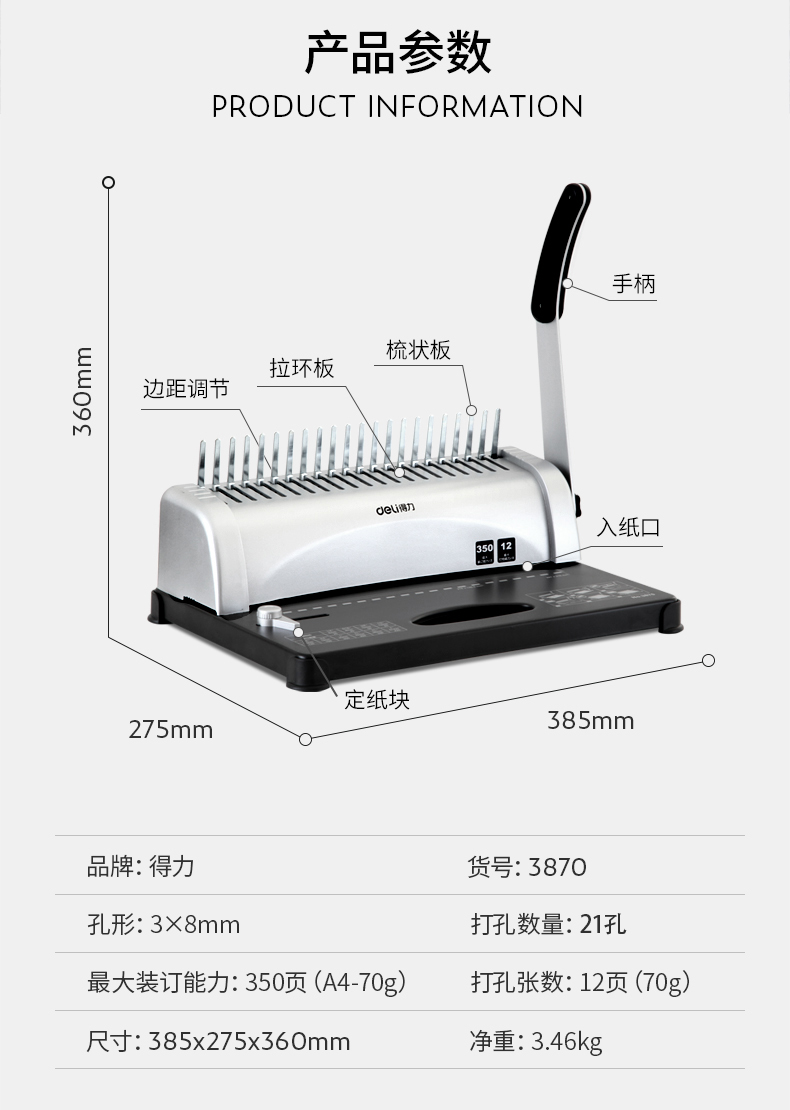 > 得力(deli)胶圈/夹条装订机 21孔文件打孔机 梳式财务装订机 3825-10孔装订夹条 5mm(约装订50张)