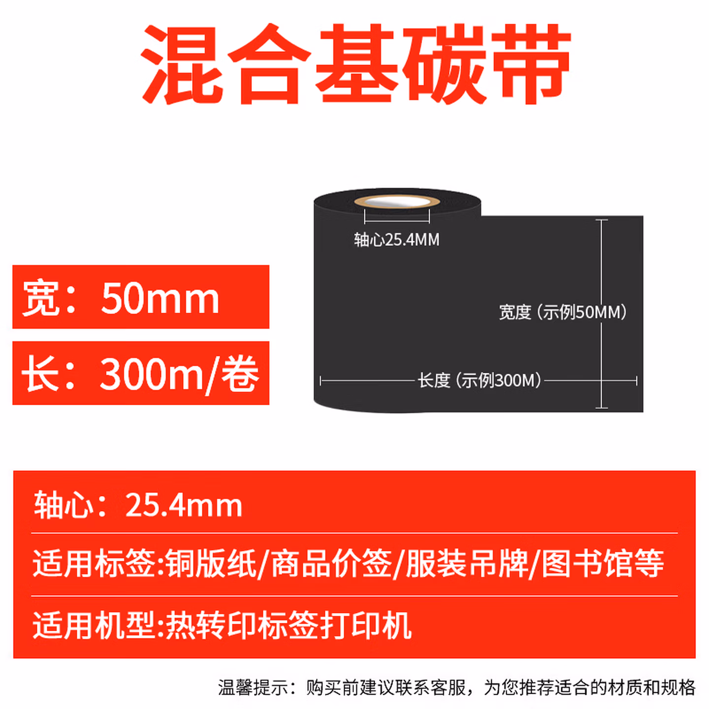 > E代混合基碳带50mm*300m单轴 适用tsc台半ttp-244pro/TE244热转印标签机条码打印机碳带卷