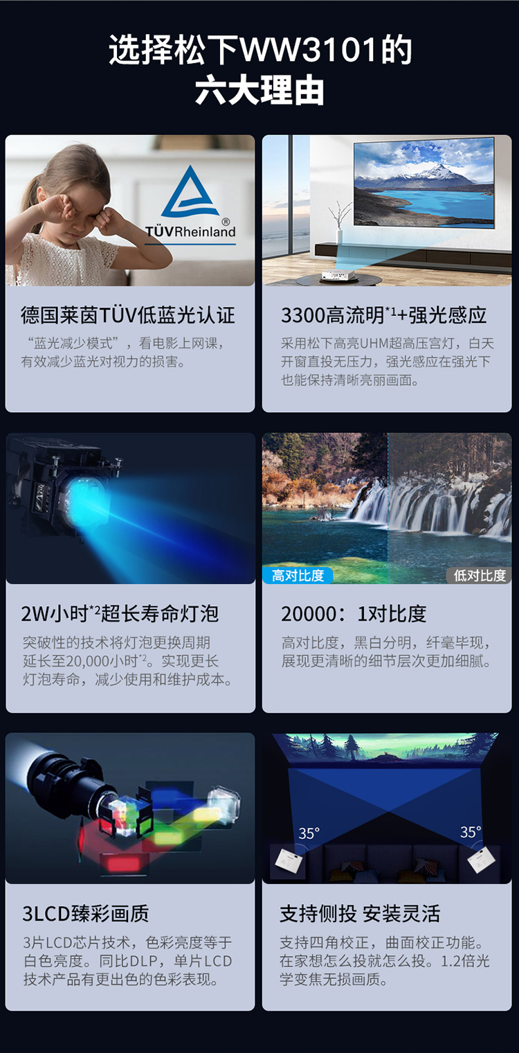 松下(Panasonic)PT-WW3101 投影仪办公 培训教学会议 投影机家用(高清宽屏 3300流明 2万小时灯源)