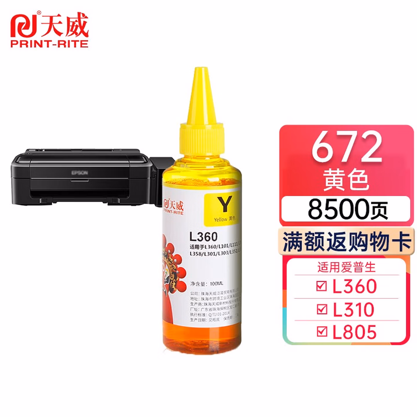 天威 T672 适用爱普生L310 380 313 310 383 405 351 363打印机 T6724黄色【100ML】