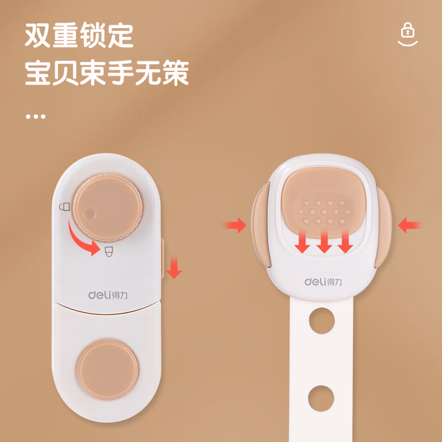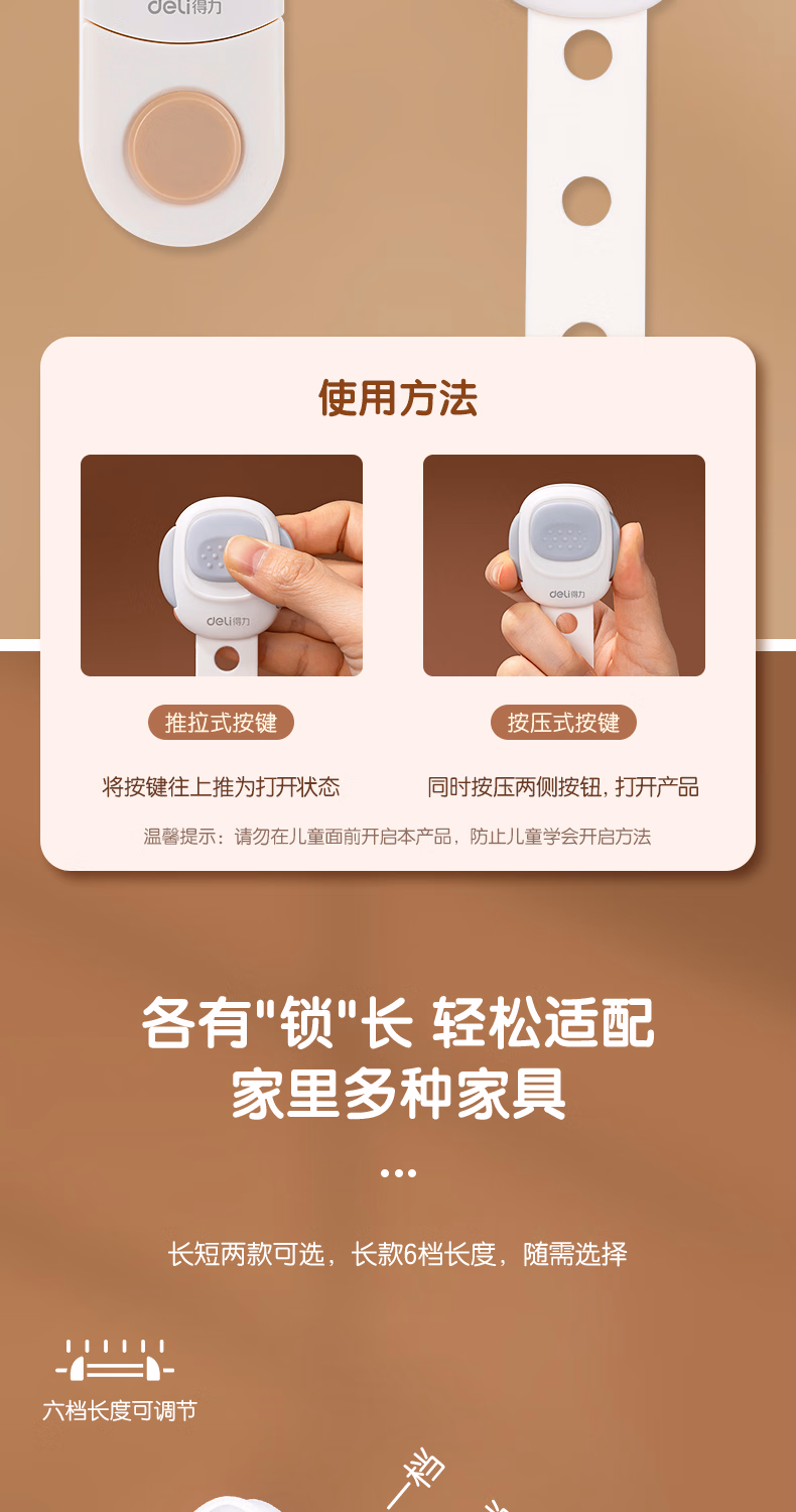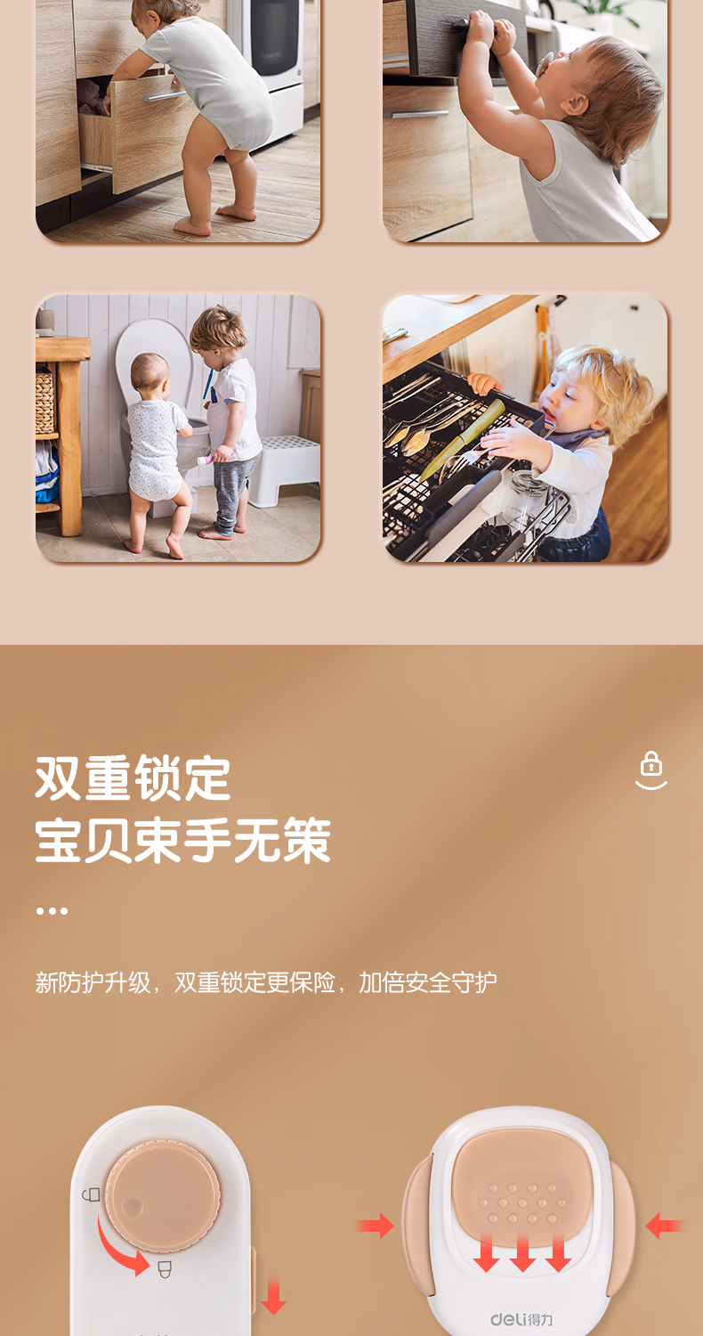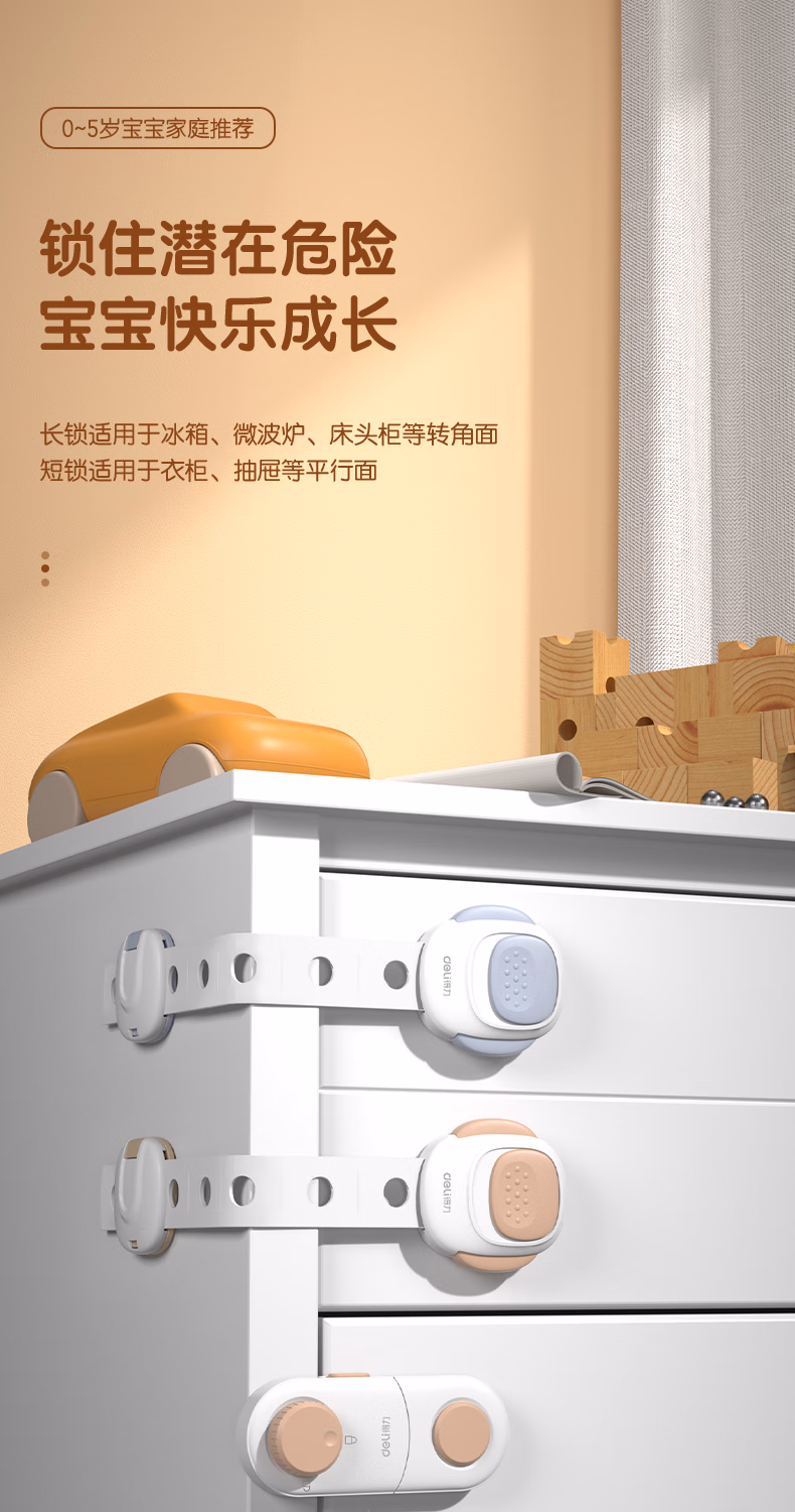 > 得力(deli)儿童安全短锁 双重锁扣 抽屉冰箱锁冰箱贴 柜子多功能锁 2个装 JF126 仓灰色