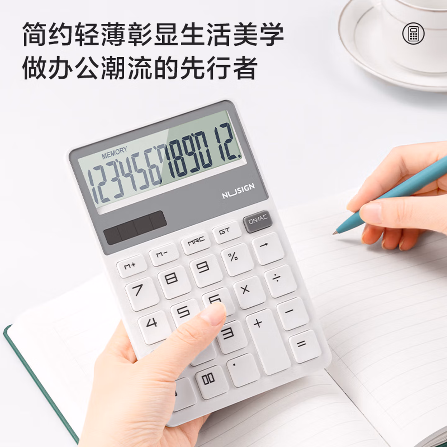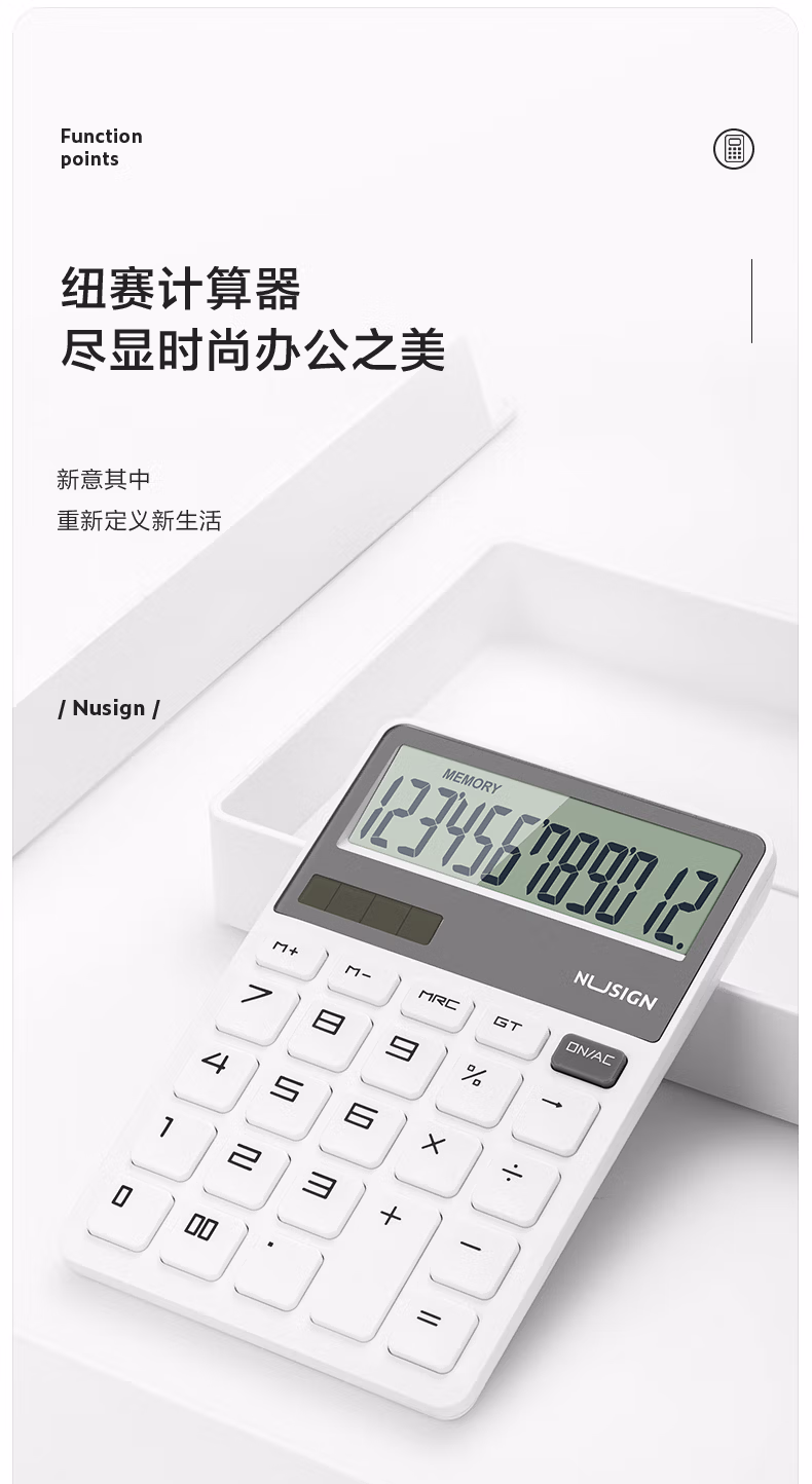 > 纽赛(NUSIGN)时尚办公计算器 德国创意设计 大按键双电源设计 时尚造型办公文具/家用 白色NS042