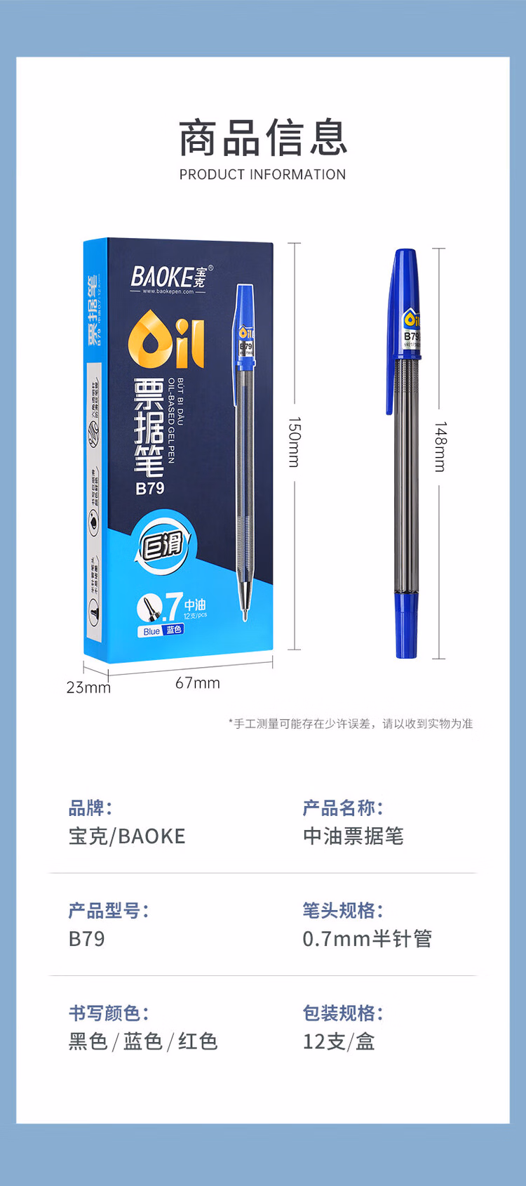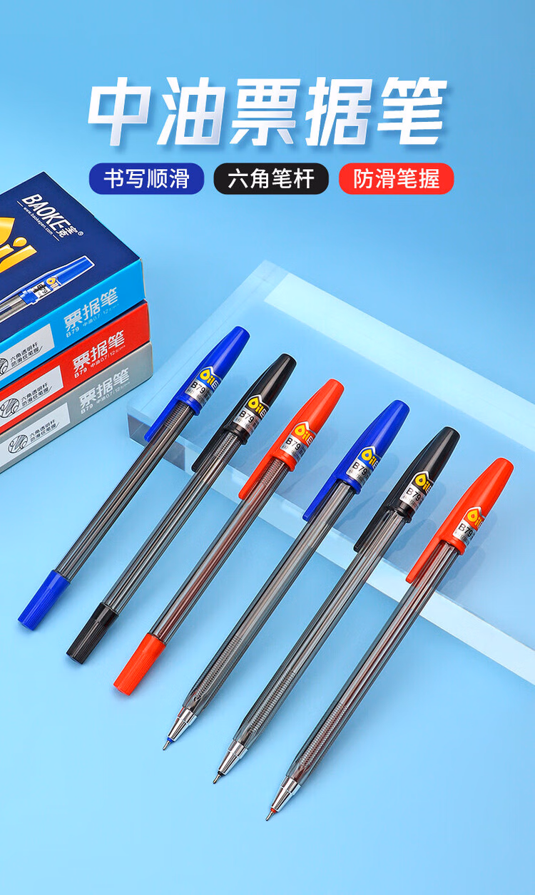 > 宝克(BAOKE)B79 圆珠笔中油笔0.7mm半针管头学生办公用原子笔票据笔 黑色 12支/盒