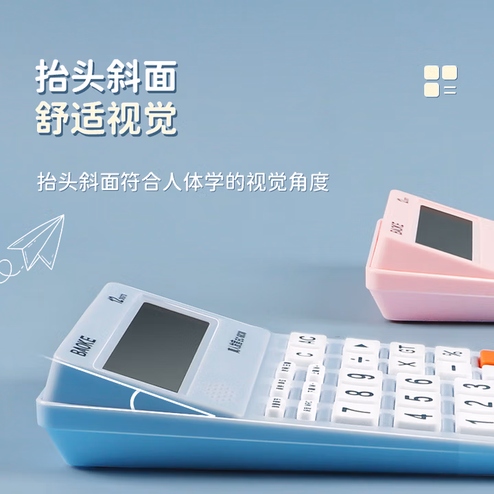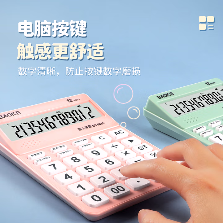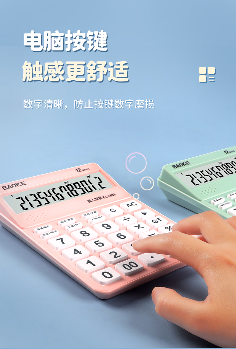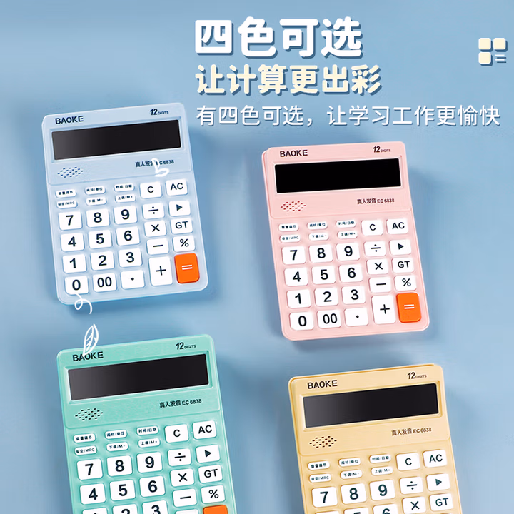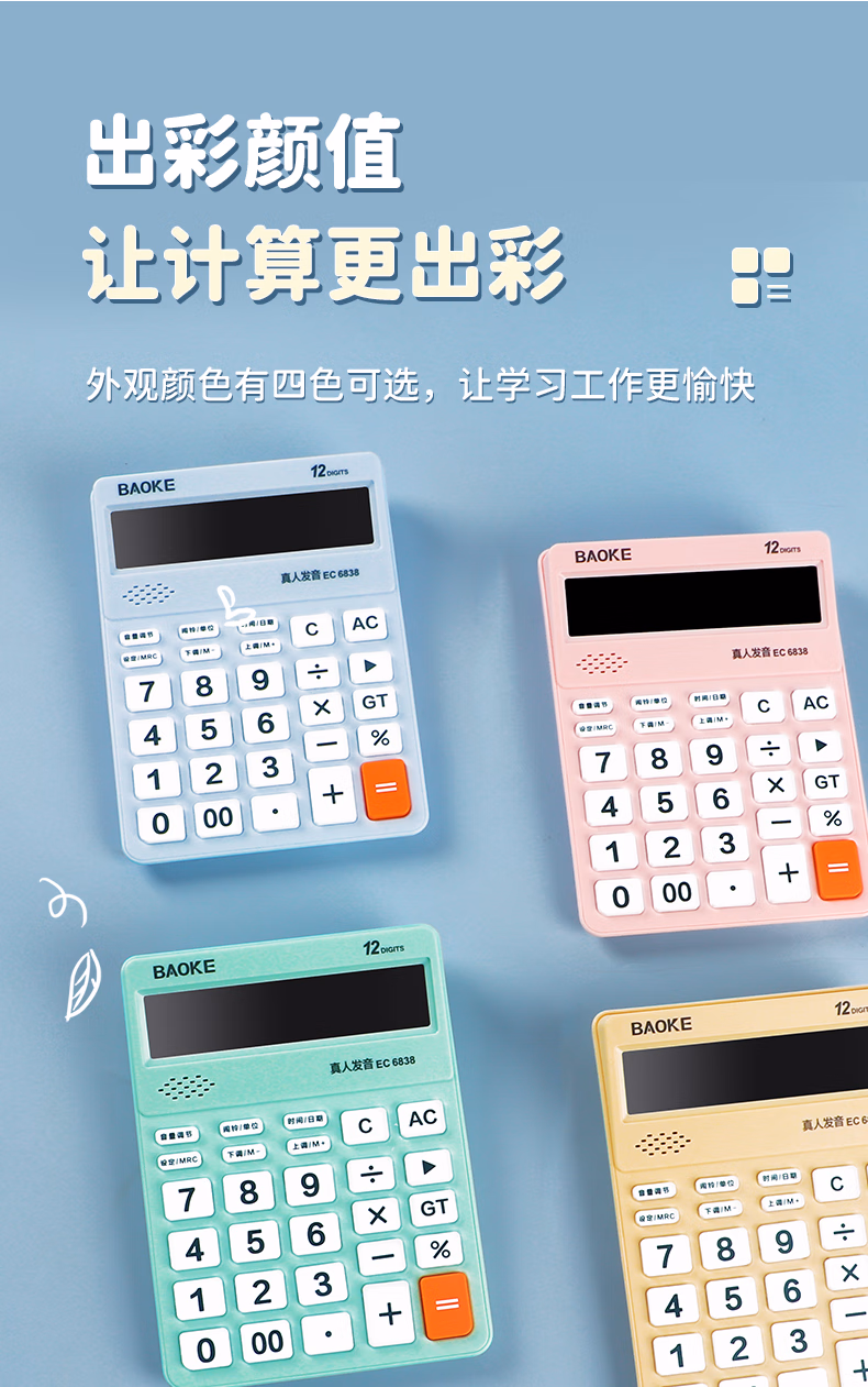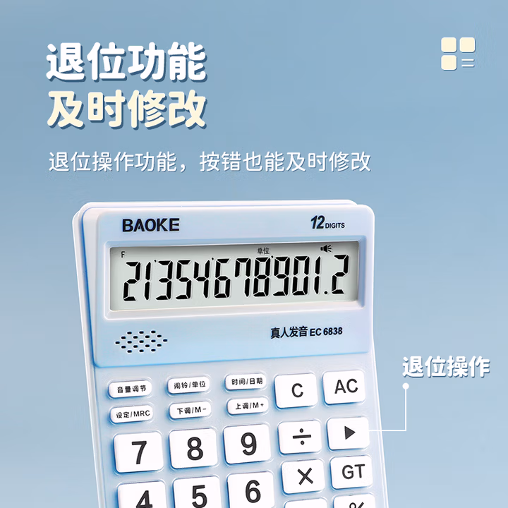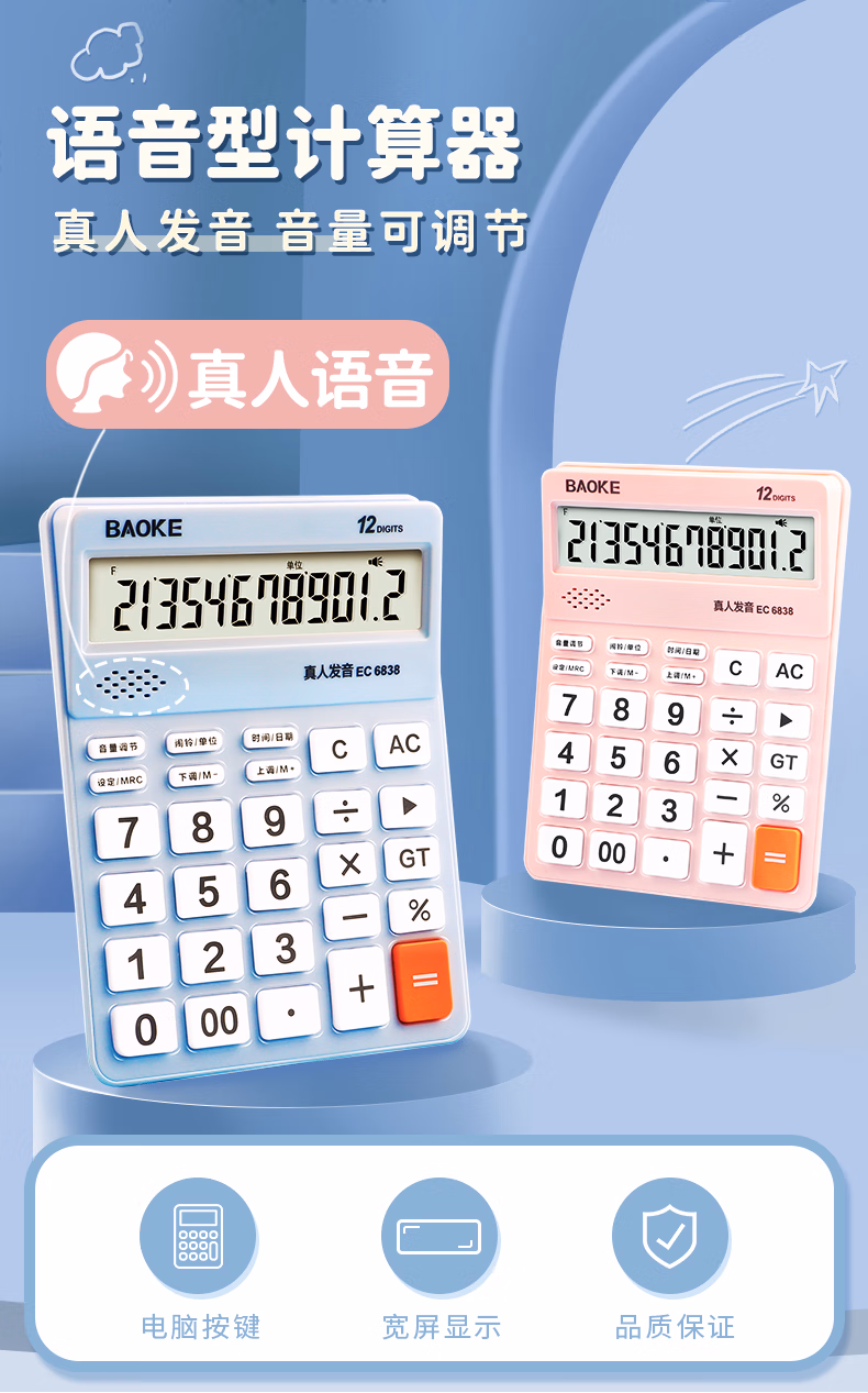 > 宝克(BAOKE)EC6838 彩色语音型计算器 12位数字显示电脑按键宽屏显示 财务办公用品 蓝色