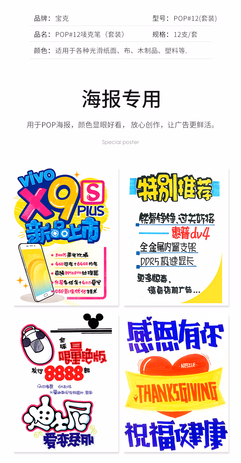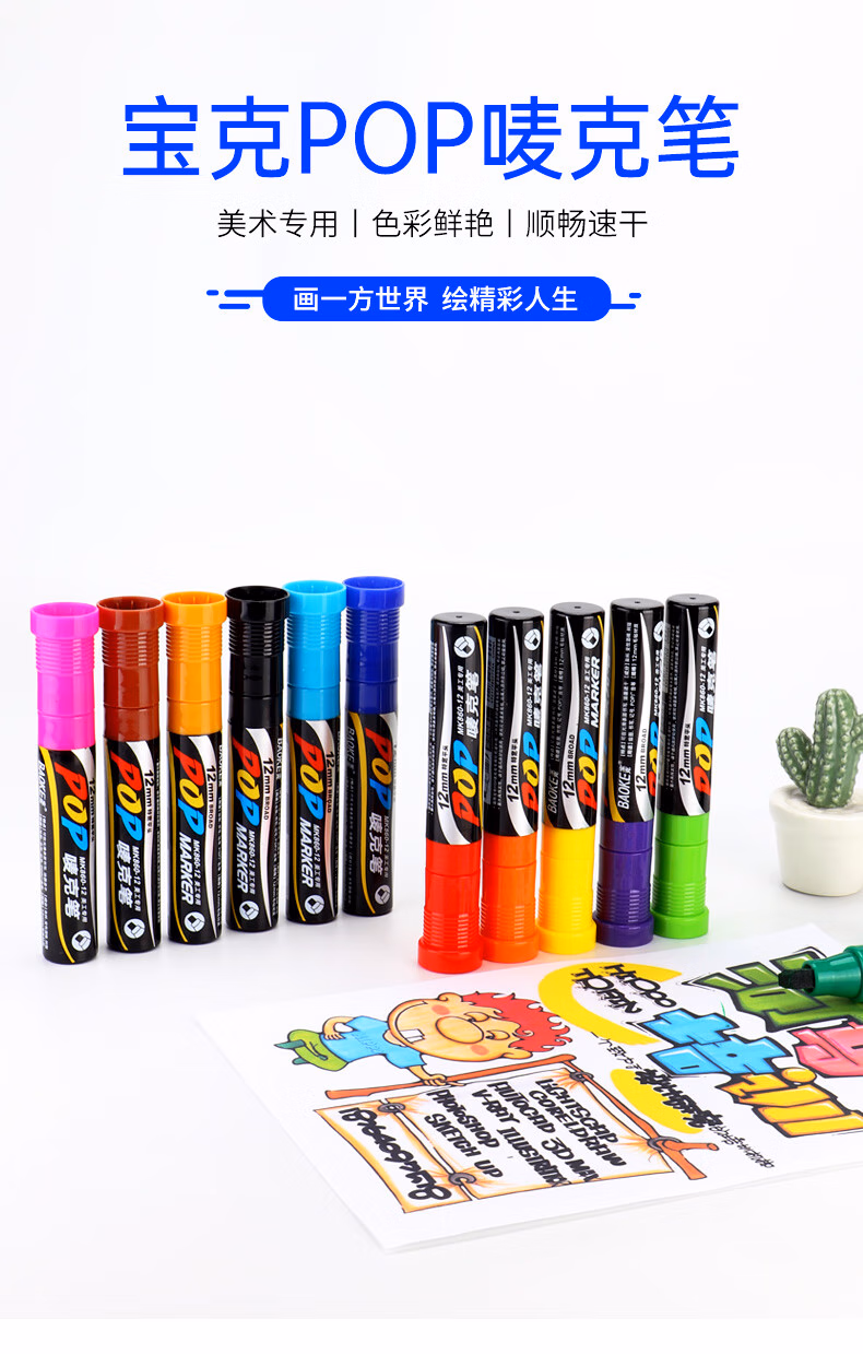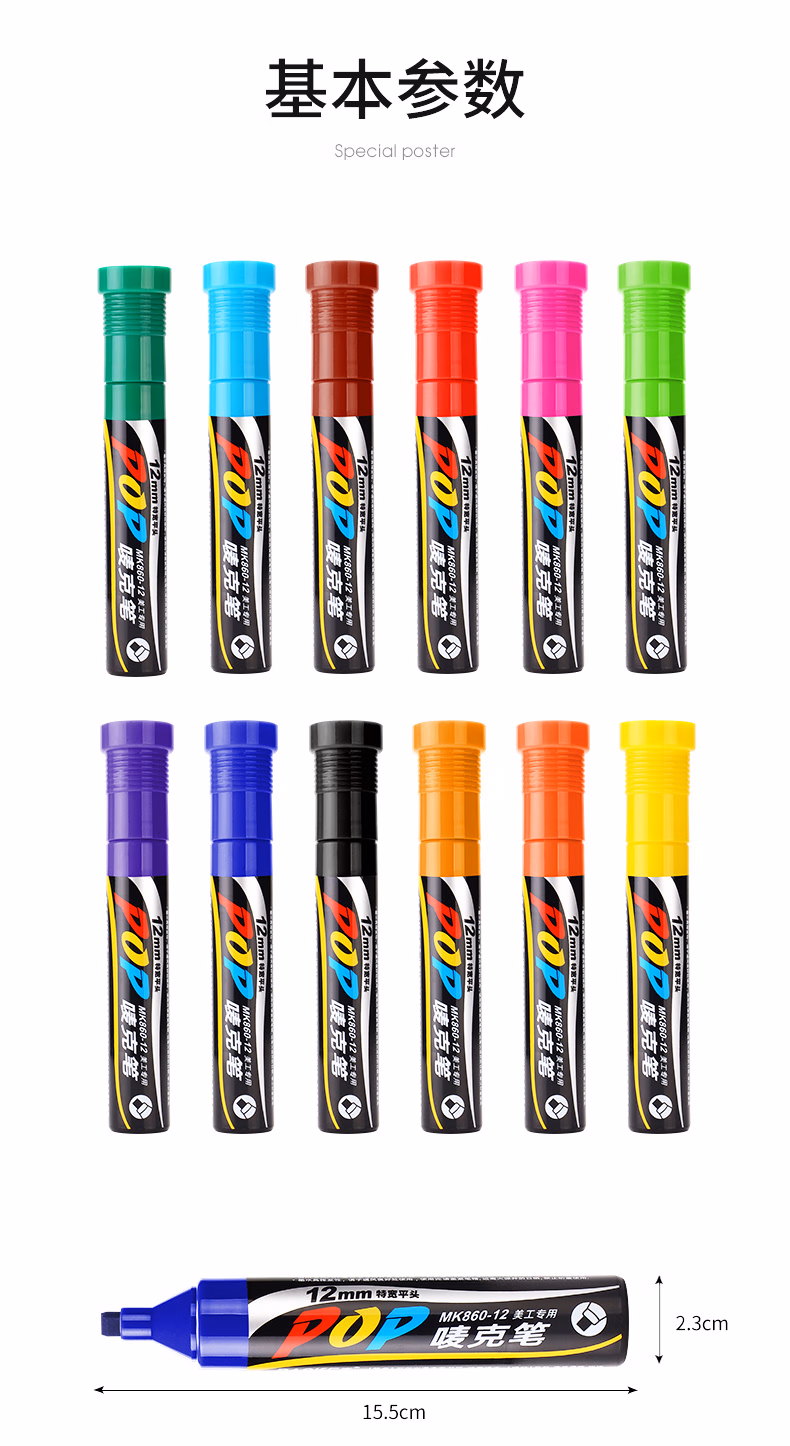 > 宝克多色POP唛克笔套装海报广告画笔彩色马克笔记号笔水笔MK86030配色12支套30mm MK860-30POP唛克笔30mm配色12支套