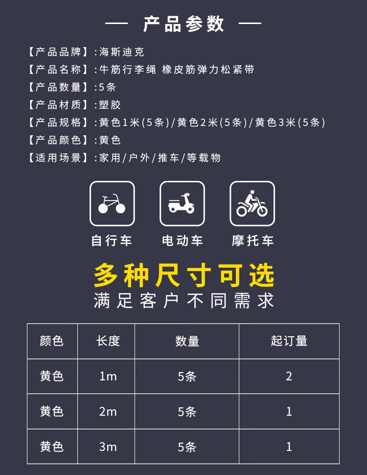 > 海斯迪克 牛筋行李绳 橡皮筋弹力松紧带捆绑绳 黄色2米/条(5条/件) HKT-27