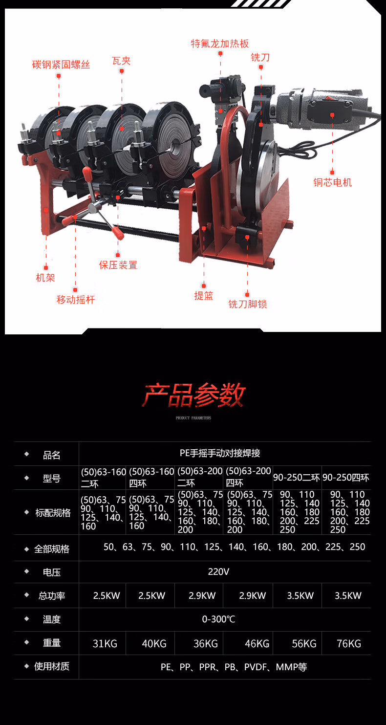 京信达定制63-160/200手动四环对焊机PE管焊接机对接机熔接热熔器焊管机 90-250四环整机(新款带保压