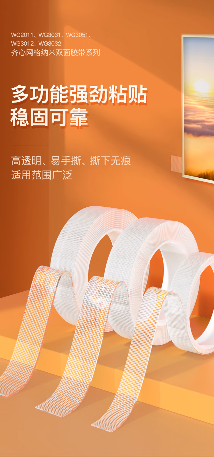 > 齐心(COMIX)纳米双面胶 30mm*3m 强力高粘透明双面胶无痕墙面贴 网格双面胶透明防水纳米胶 1卷 WG3031