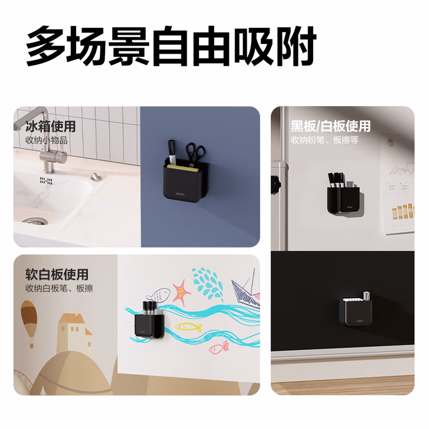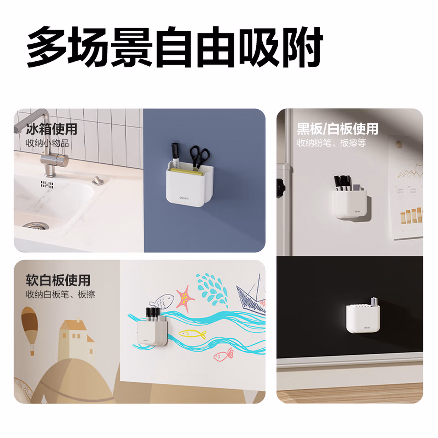 > 得力可折叠磁性白色笔筒 白板笔收纳盒黑板壁挂磁铁笔盒磁吸粉笔挂墙黑板擦墙贴悬挂式白板100*23*84mm