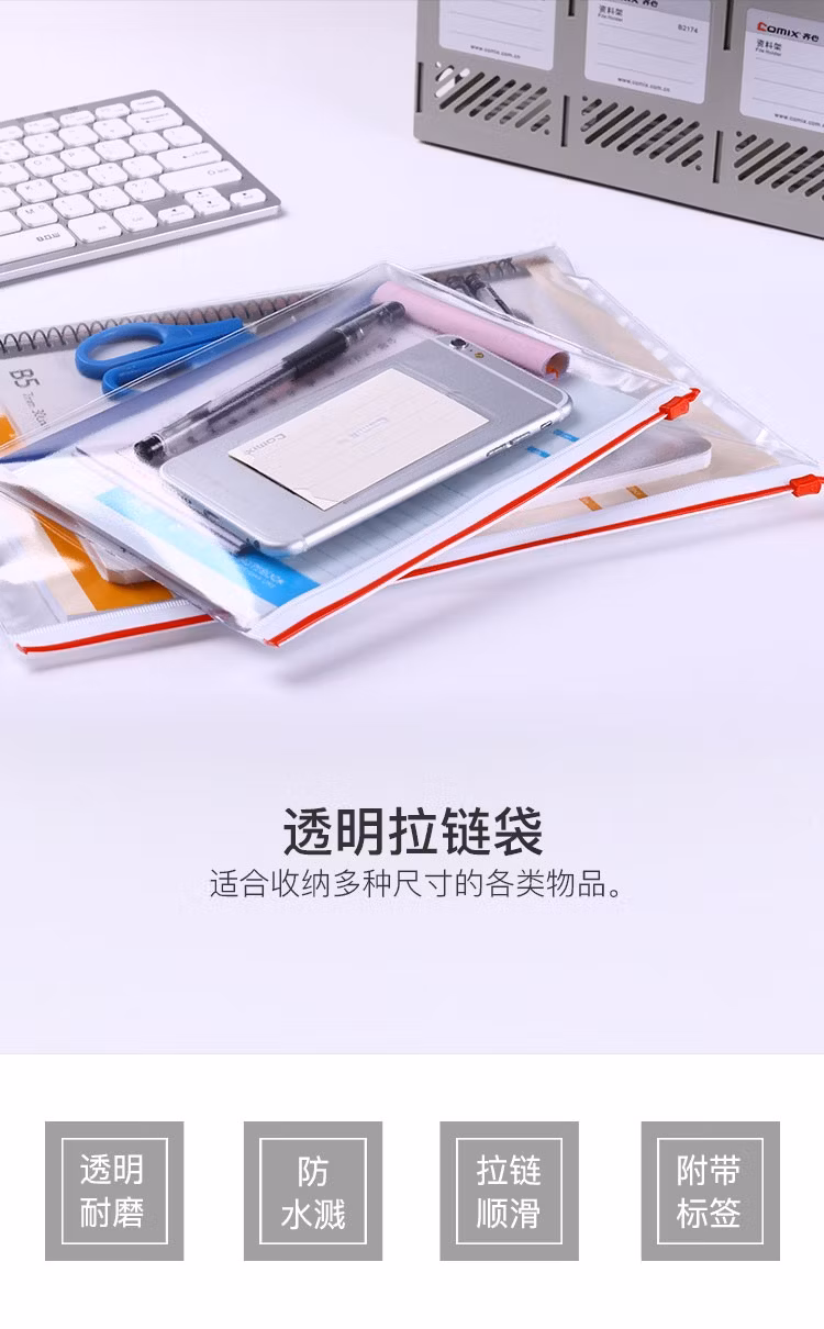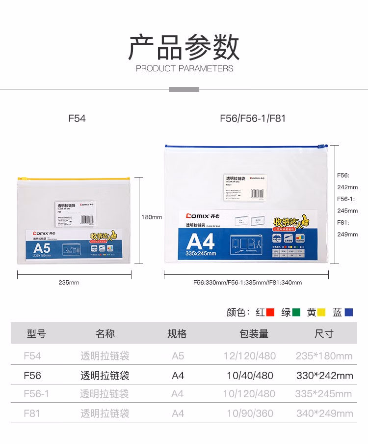 齐心(Comix) F54/F56拉链袋密封防水资料袋A4/A5文件袋学生文具归类办公收纳袋5只装 F56-1 A4 拉链袋 五个装价