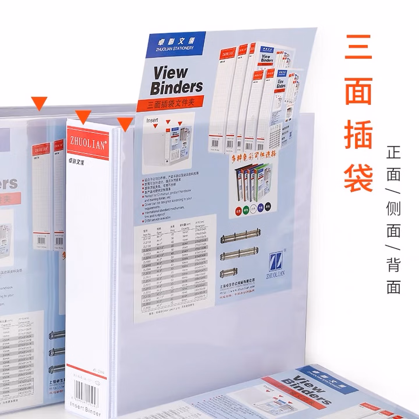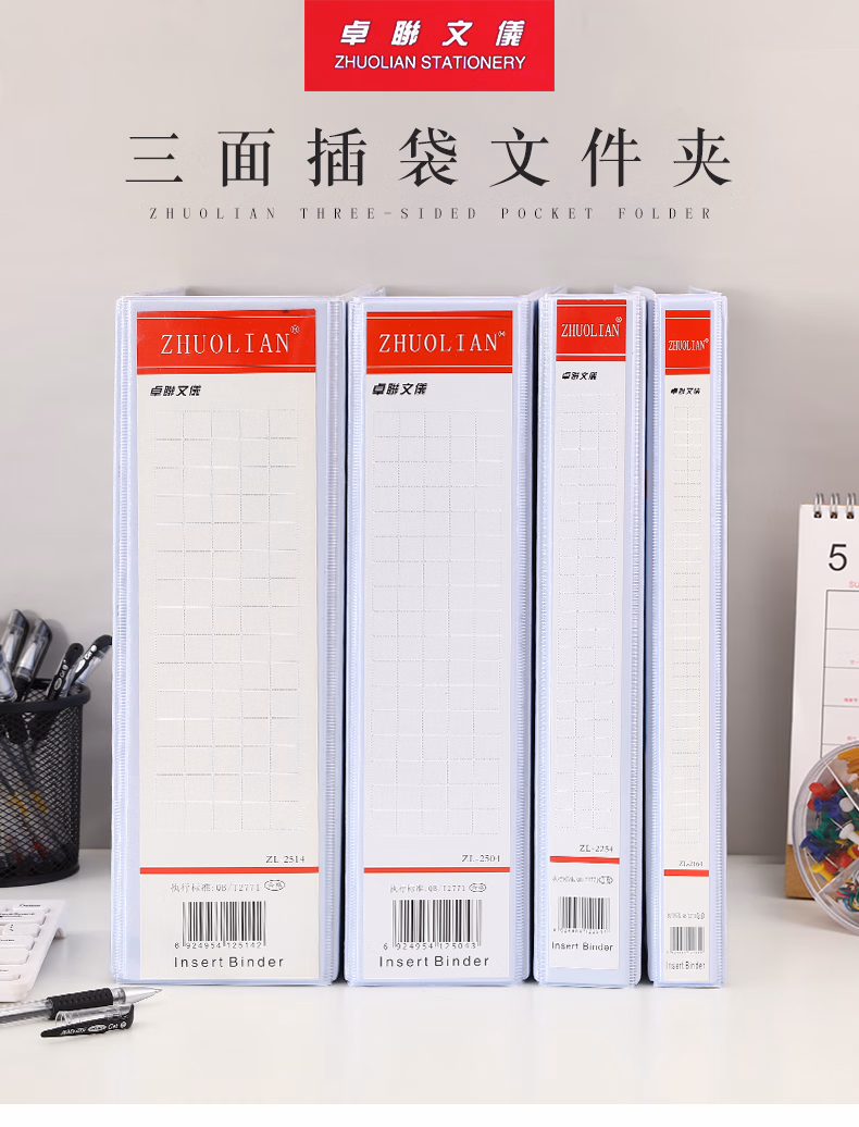 > 卓联ZL-2252三面插袋文件夹A4 38mm加插封面打孔白夹 两孔D型夹 二孔文件夹容纸量25mm 白色