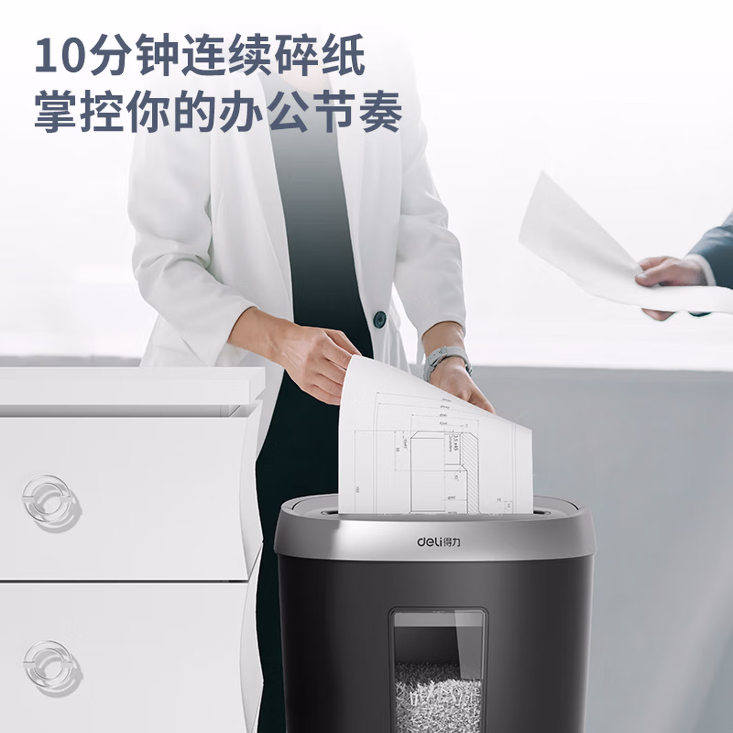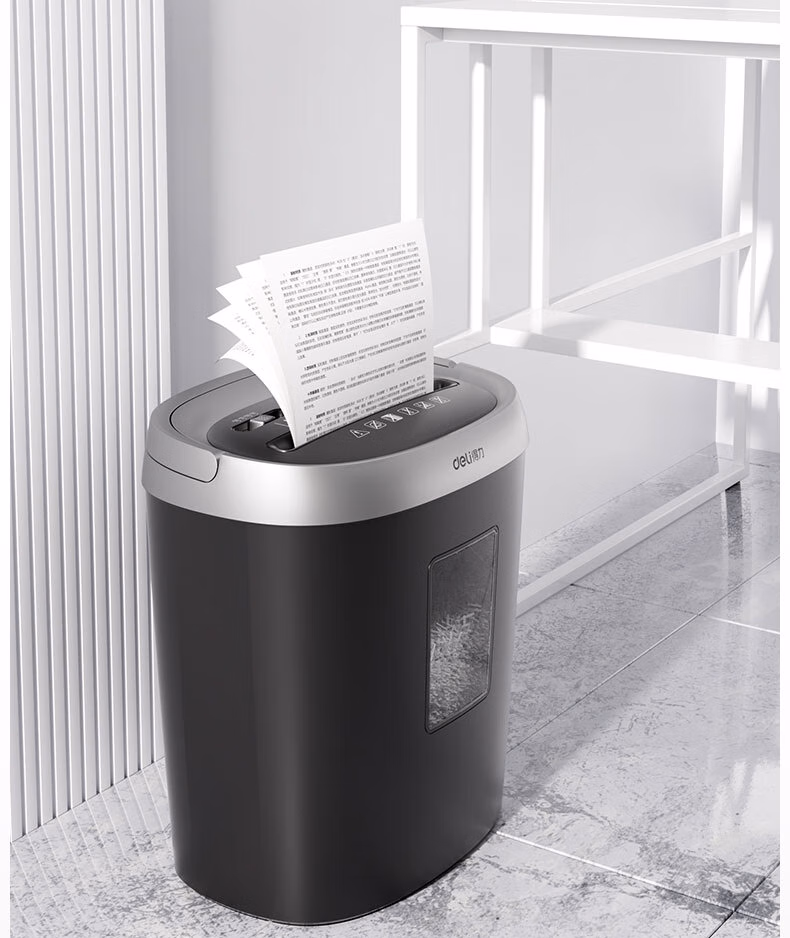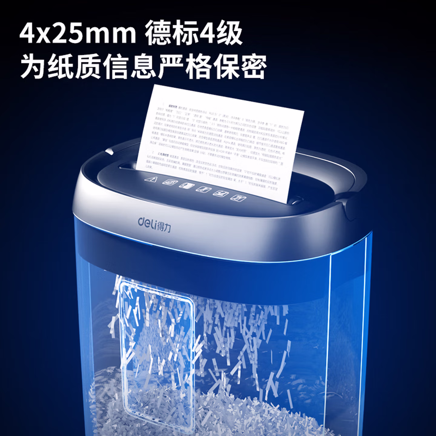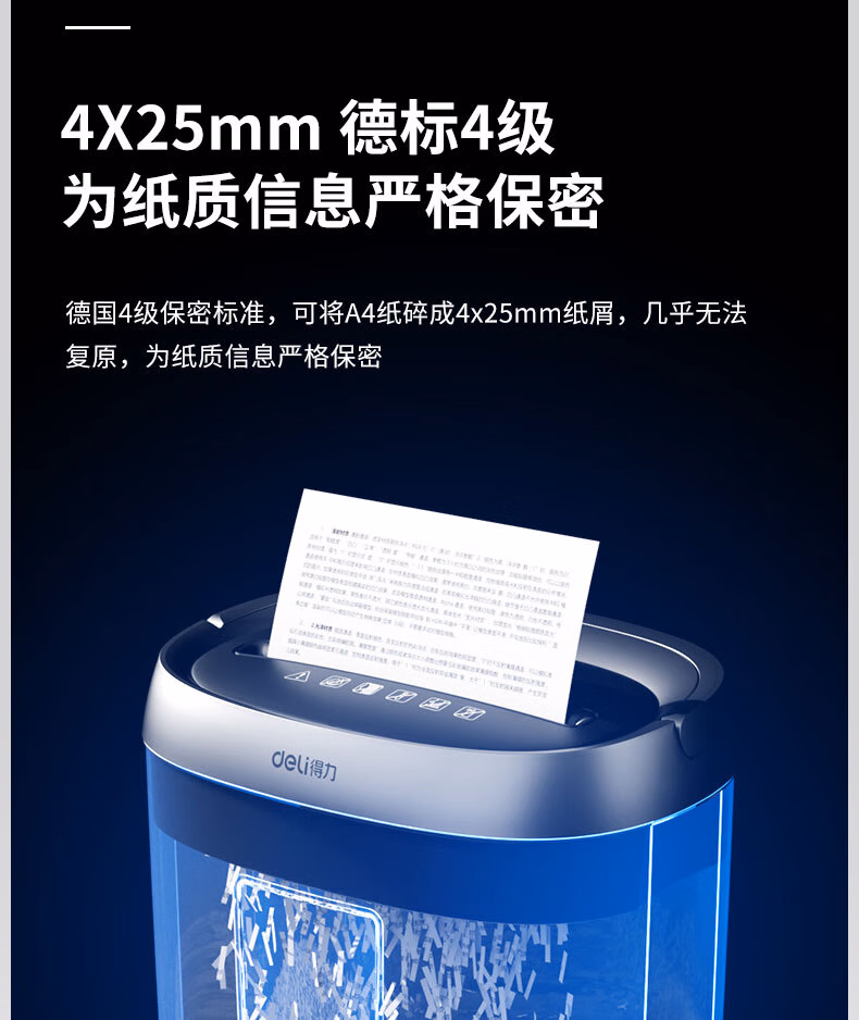 > 得力(deli)高保密碎纸机 大型文件粉碎机电动商用办公碎纸机 8张 20分钟 23L 5级 可带钉碎纸GA590 5张 10分钟 20L 4级保密 GA191