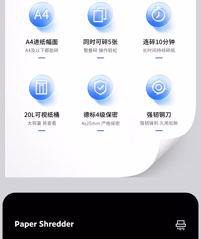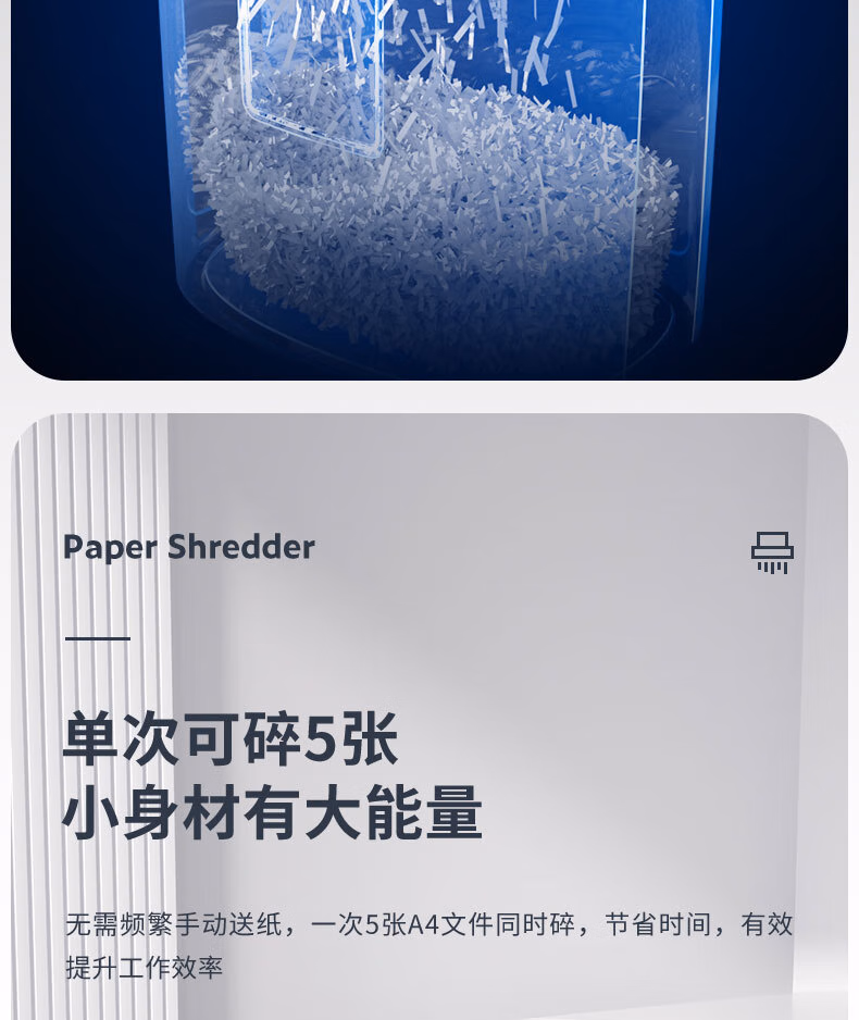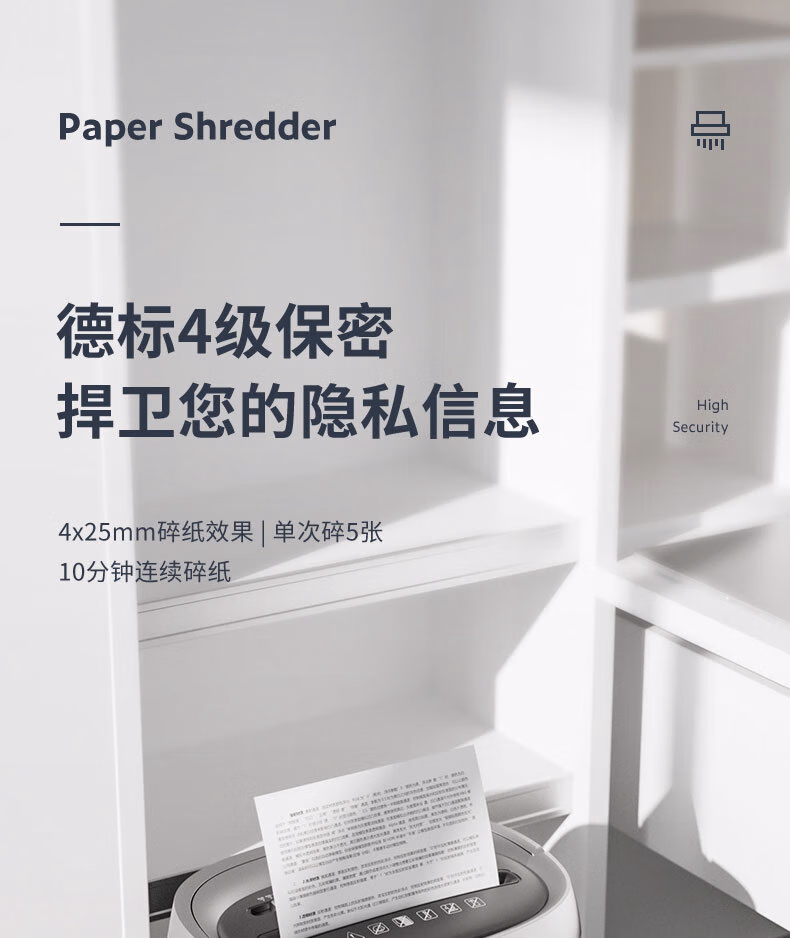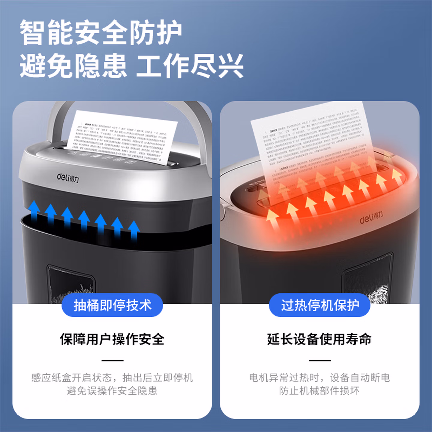 > 得力(deli)高保密碎纸机 大型文件粉碎机电动商用办公碎纸机 8张 20分钟 23L 5级 可带钉碎纸GA590 5张 10分钟 20L 4级保密 GA191