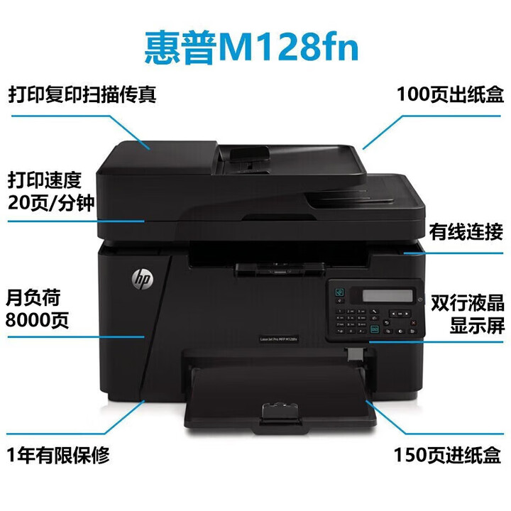> 惠普(HP)M128fn黑白激光打印机 打印复印扫描传真多功能一体机 升级型号为1188pnw