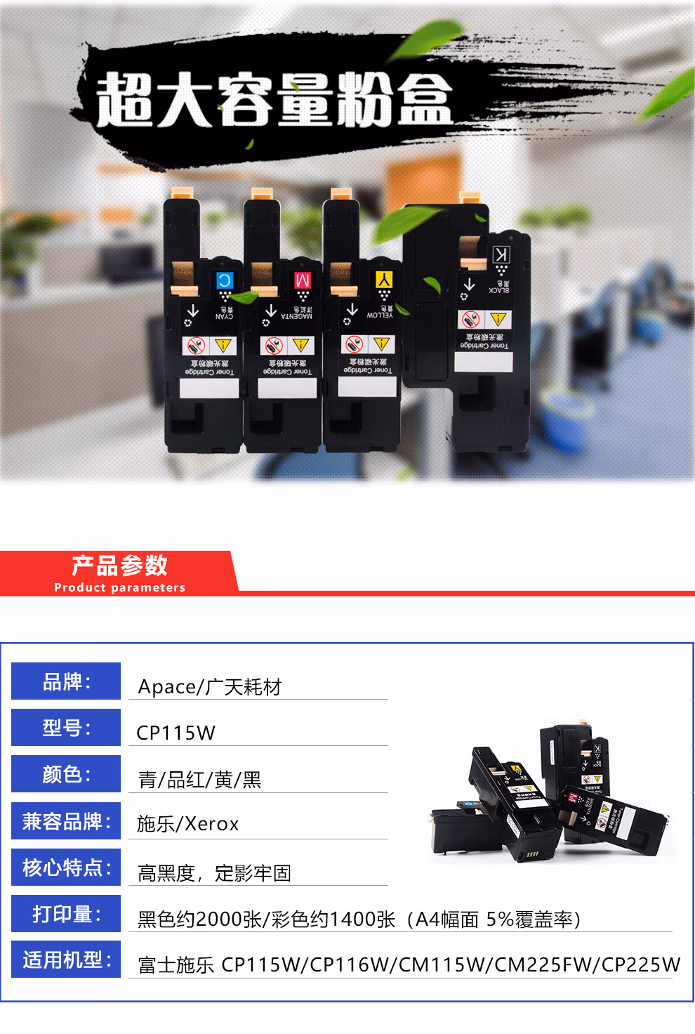 > APACE适用施乐CP115W粉盒CP116W墨盒CM115W墨粉CM225FW碳粉彩色打印机 红色粉盒一支装