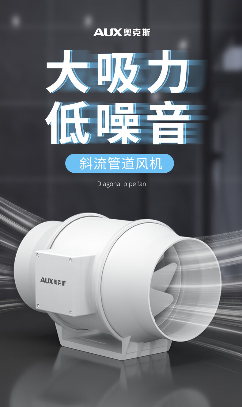 > 奥克斯(AUX)换气扇管道风机斜流增压家用油烟机强吸力静音排风扇抽风机排气扇 【风量210m3/h】单速管接100mm