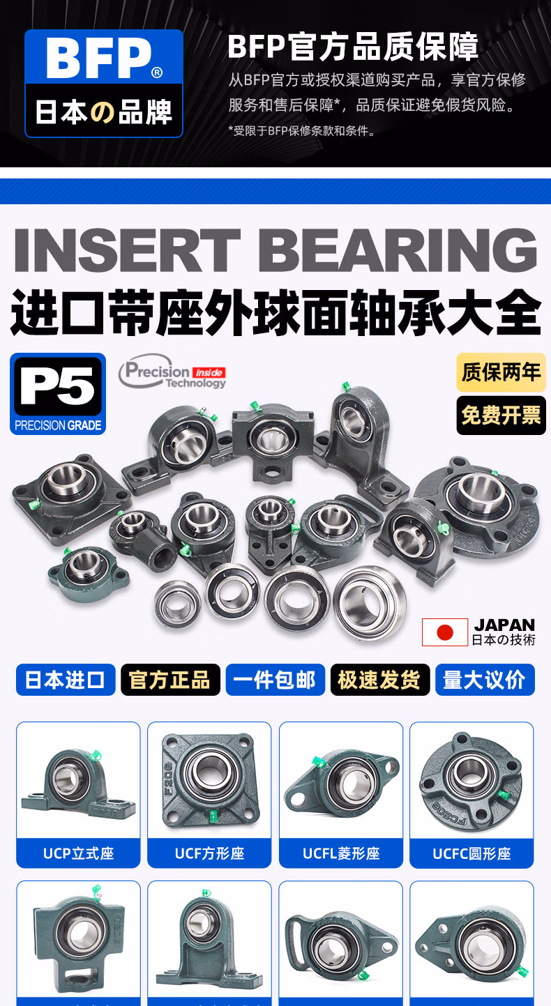 > 日本BFP进口带座外球面轴承立式P型轴承座套底座固定调心球面重型铸钢铸高精密 UCP205加厚加重【P5精密级】内径25