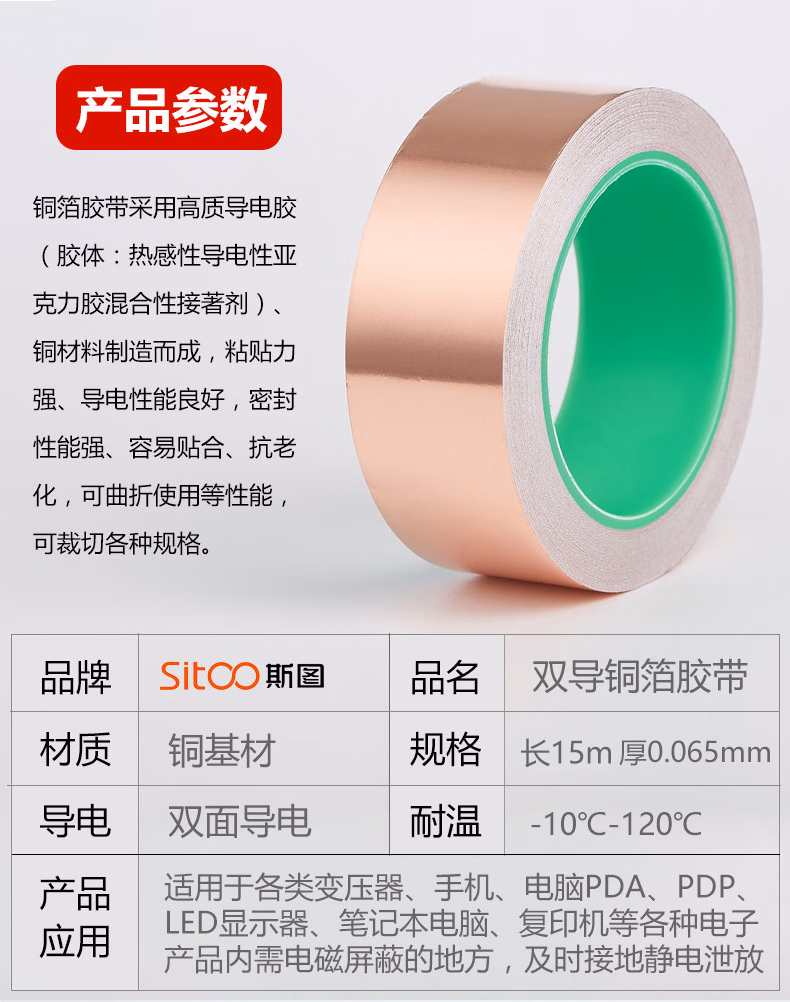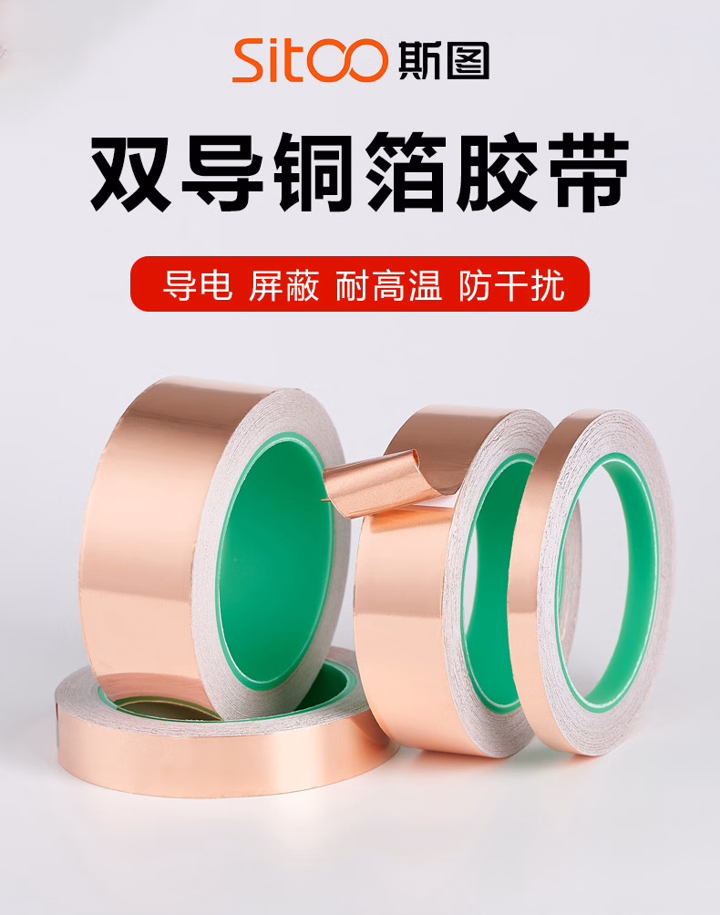 > 斯图(sitoo)双面铜箔胶带导电胶布纯铜耐高温信号增强屏蔽胶带散热铜箔贴纸 双导铜箔胶带 10mm*15米 1卷