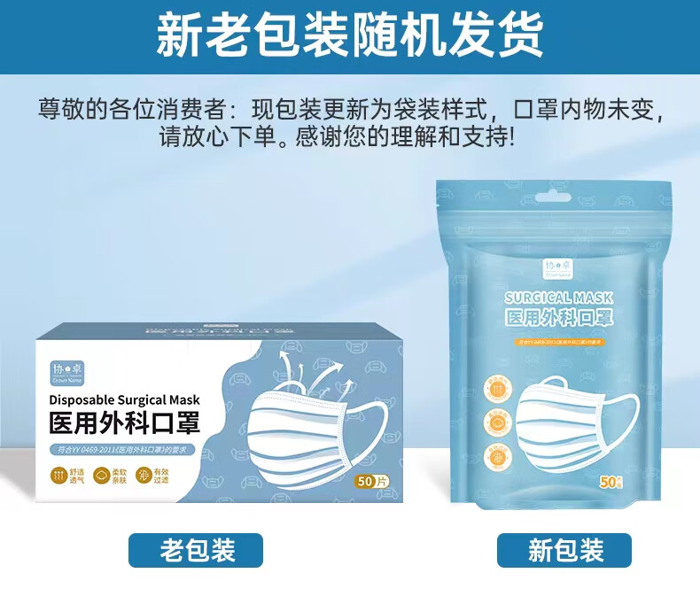> 协卓一次性使用医用外科口罩防尘防飞沫成人三层防护舒适透气 50只/盒