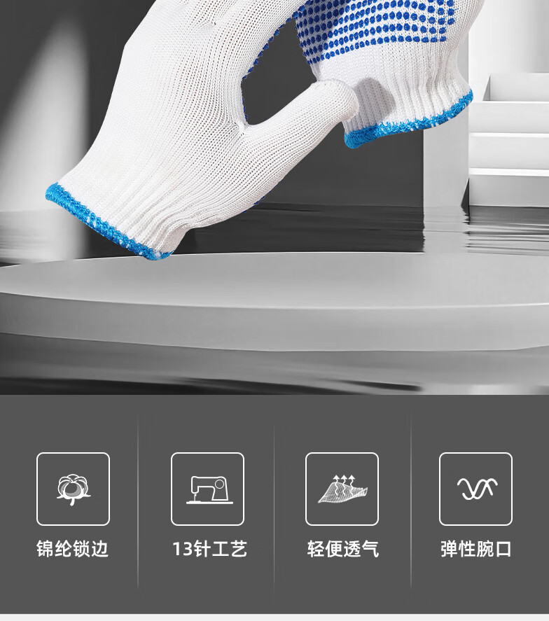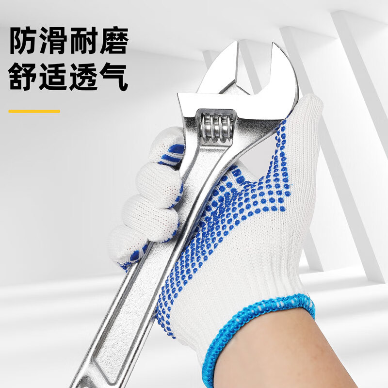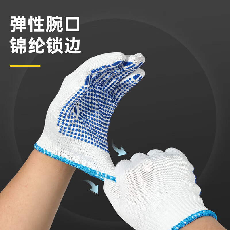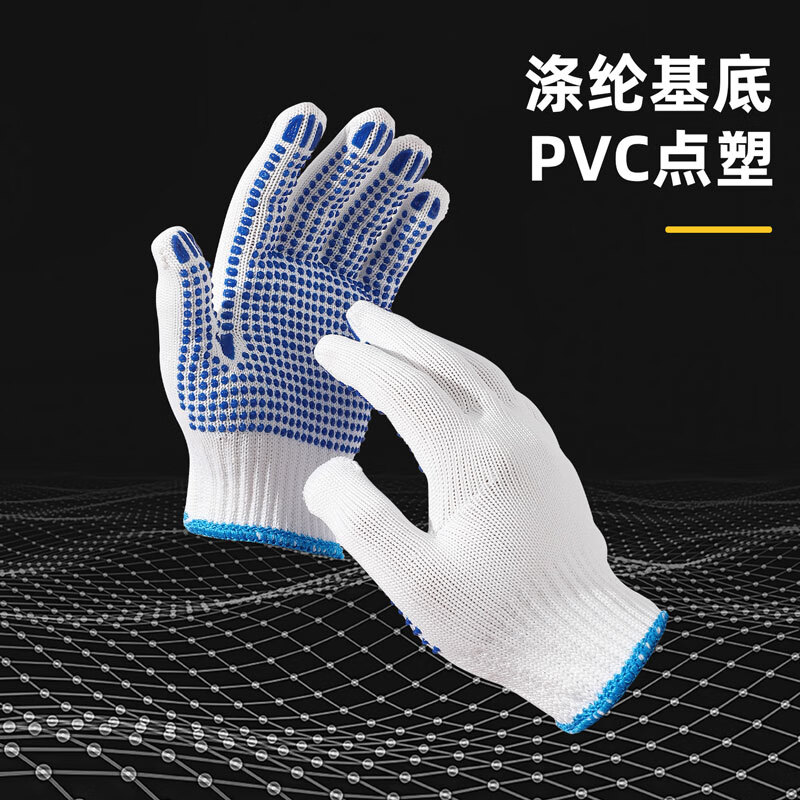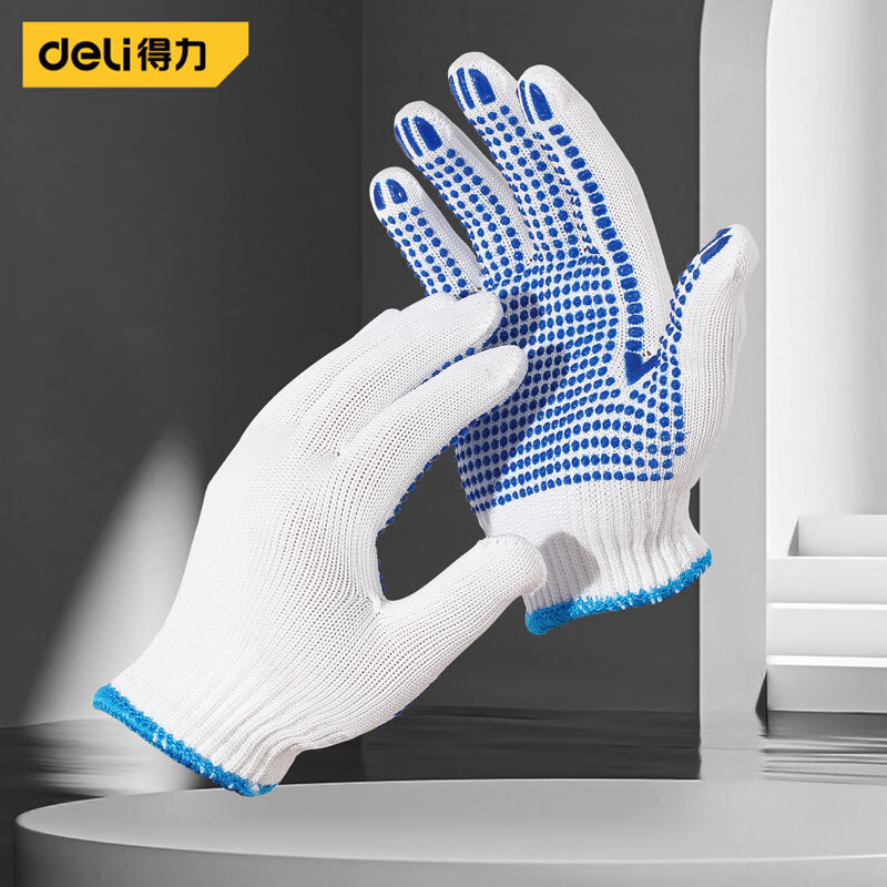 > 得力(deli)涤纶PVC点珠手套园艺手套点珠加厚耐磨劳防手套12双应急常备 蓝色