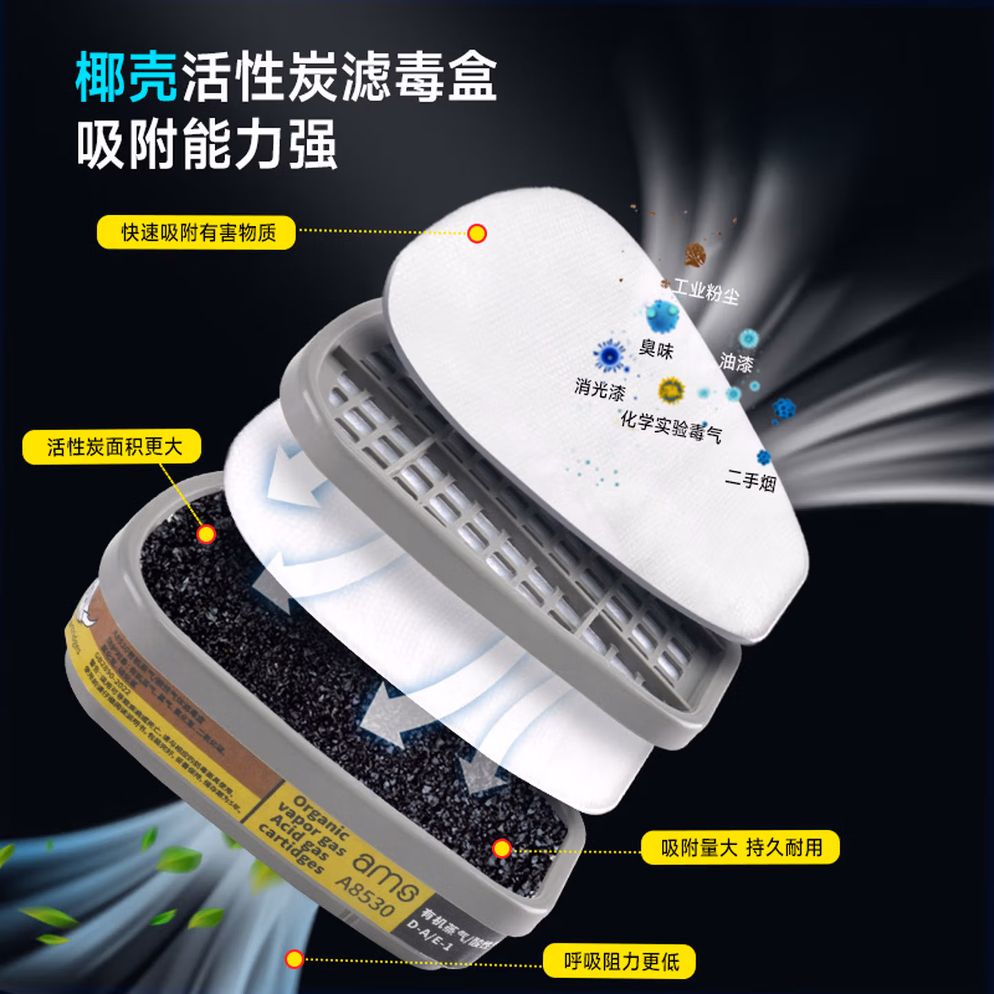 安美尚(ams)防毒面具滤毒盒防SO2/NO2/HCl等酸性气体打农药煤矿开采活性炭防护工厂防甲醛专用面罩原装正品护目镜