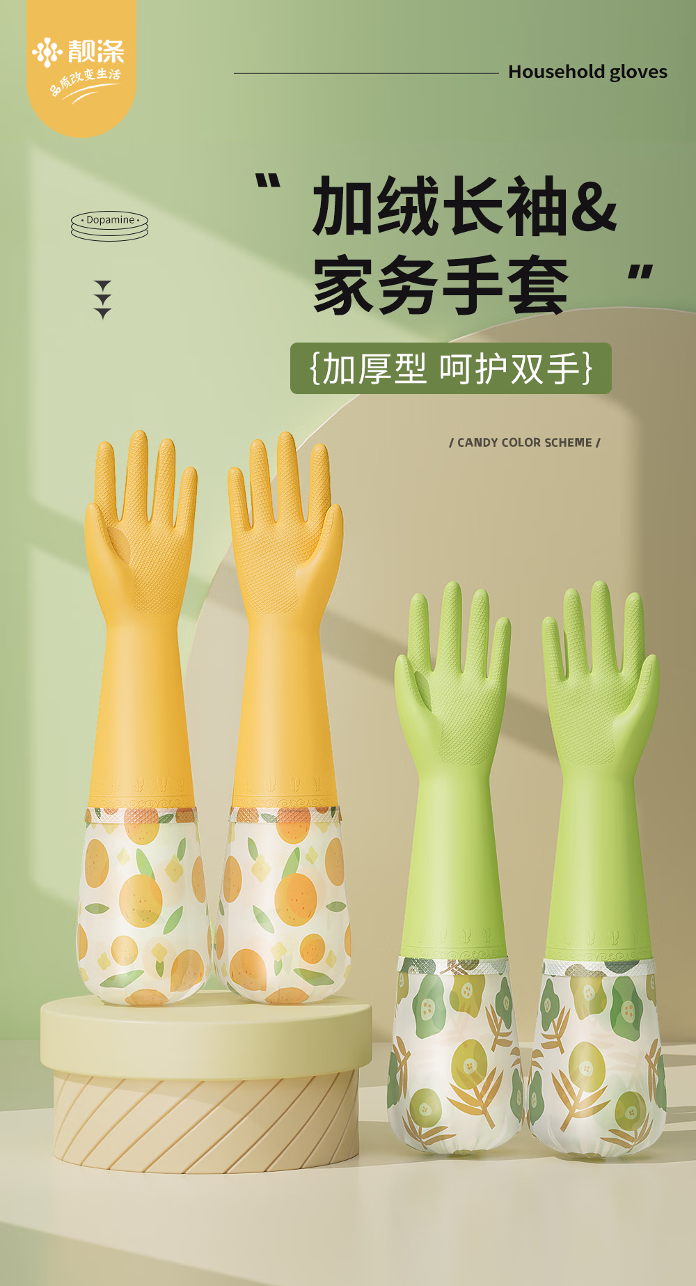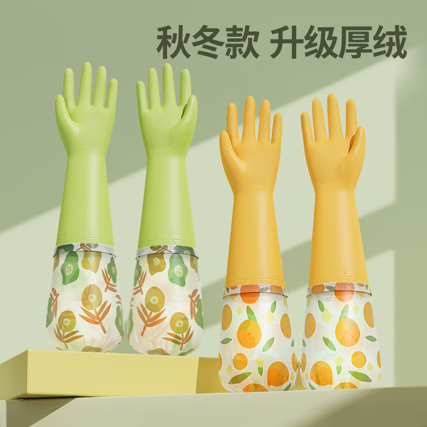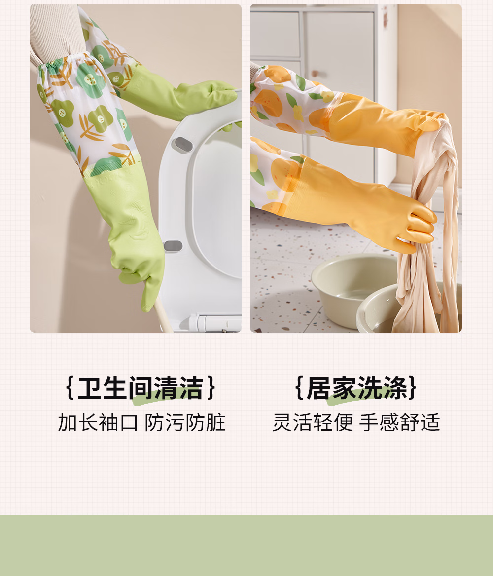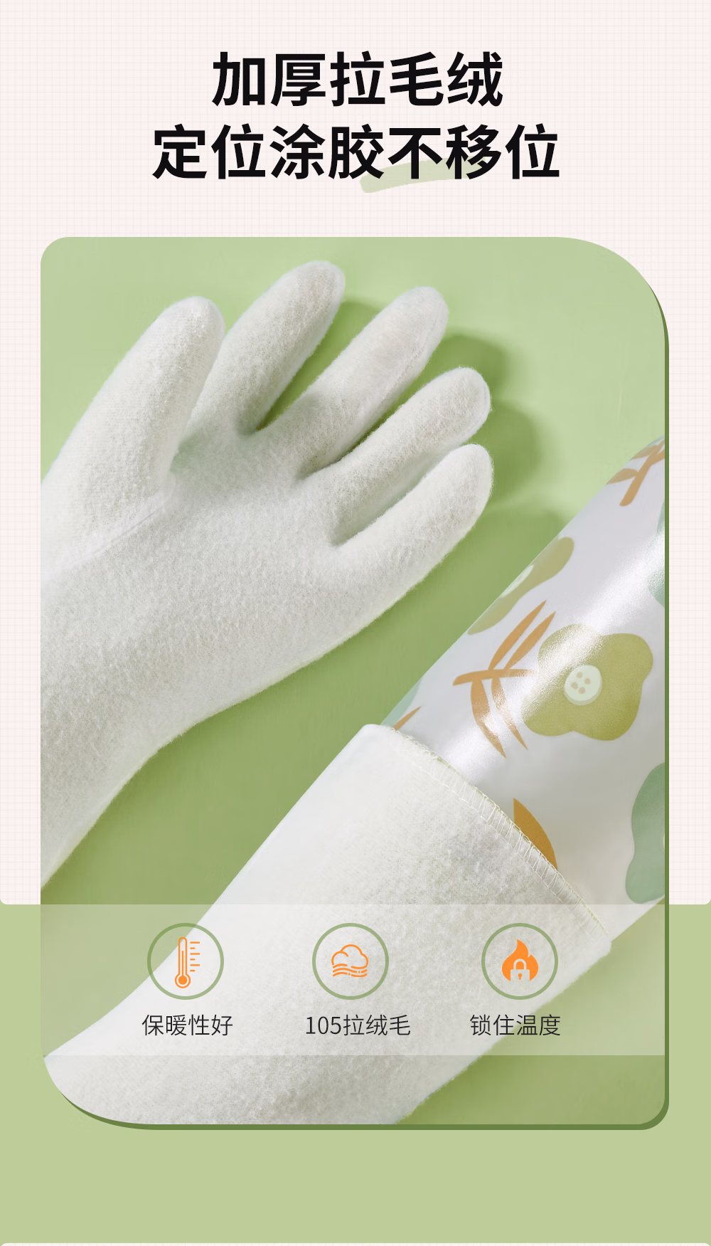 > 靓涤加绒手套家务洗碗厨房清洁防水防滑橡胶耐用型洗衣服加厚保暖冬季 1双装升级厚绒加长款-绿色 1双