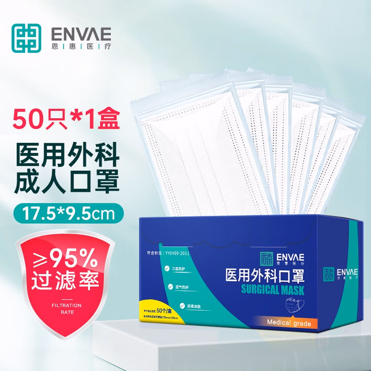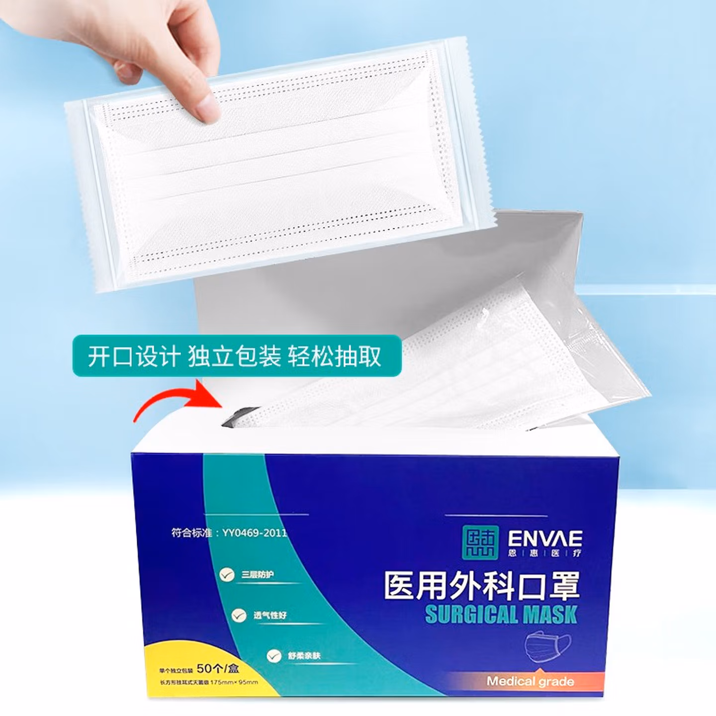 > ENVAE恩惠医疗一次性医用外科口罩成人灭菌级儿童6-12岁秋冬季保暖防尘 白色|外科灭菌50只·单片独立装