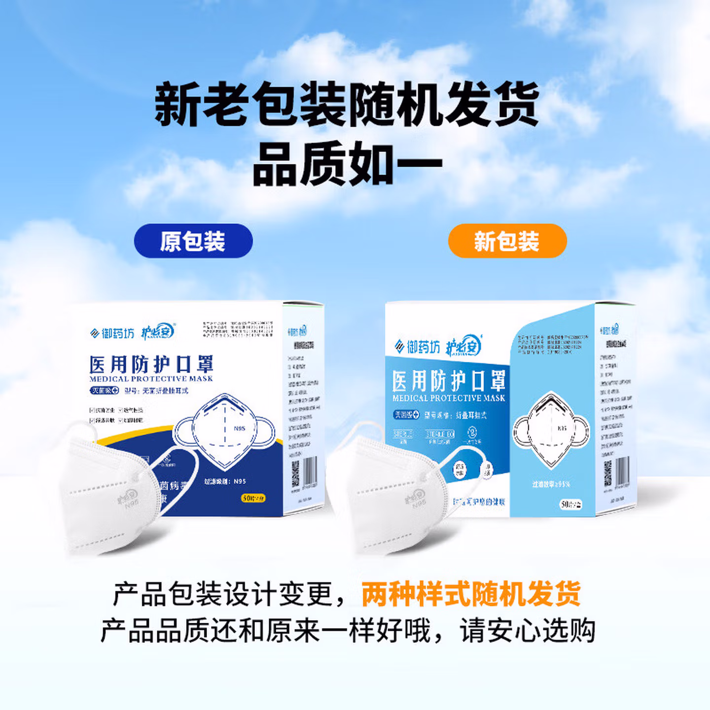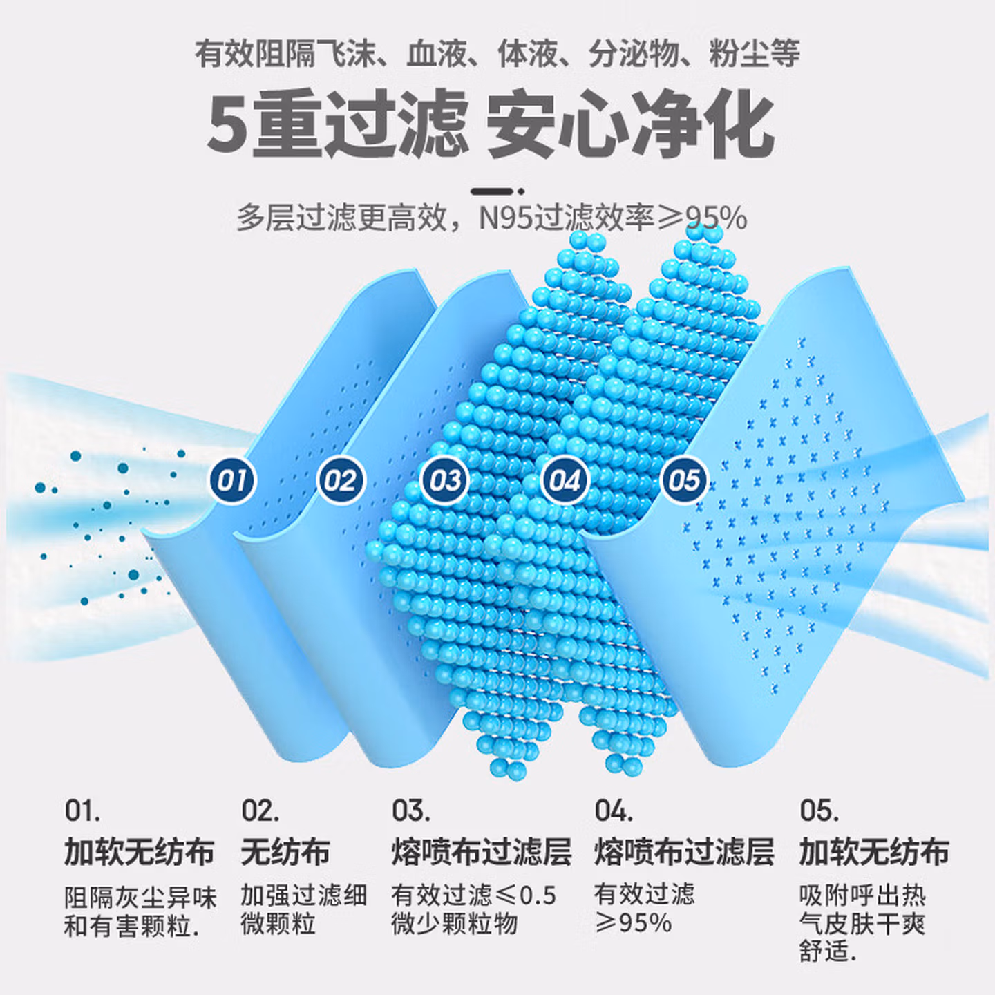 > 御药坊 口罩n95口罩医用口罩五层防护医用口罩防护一次性灭菌口罩双层熔喷布独立包装防细菌甲流 白色50只