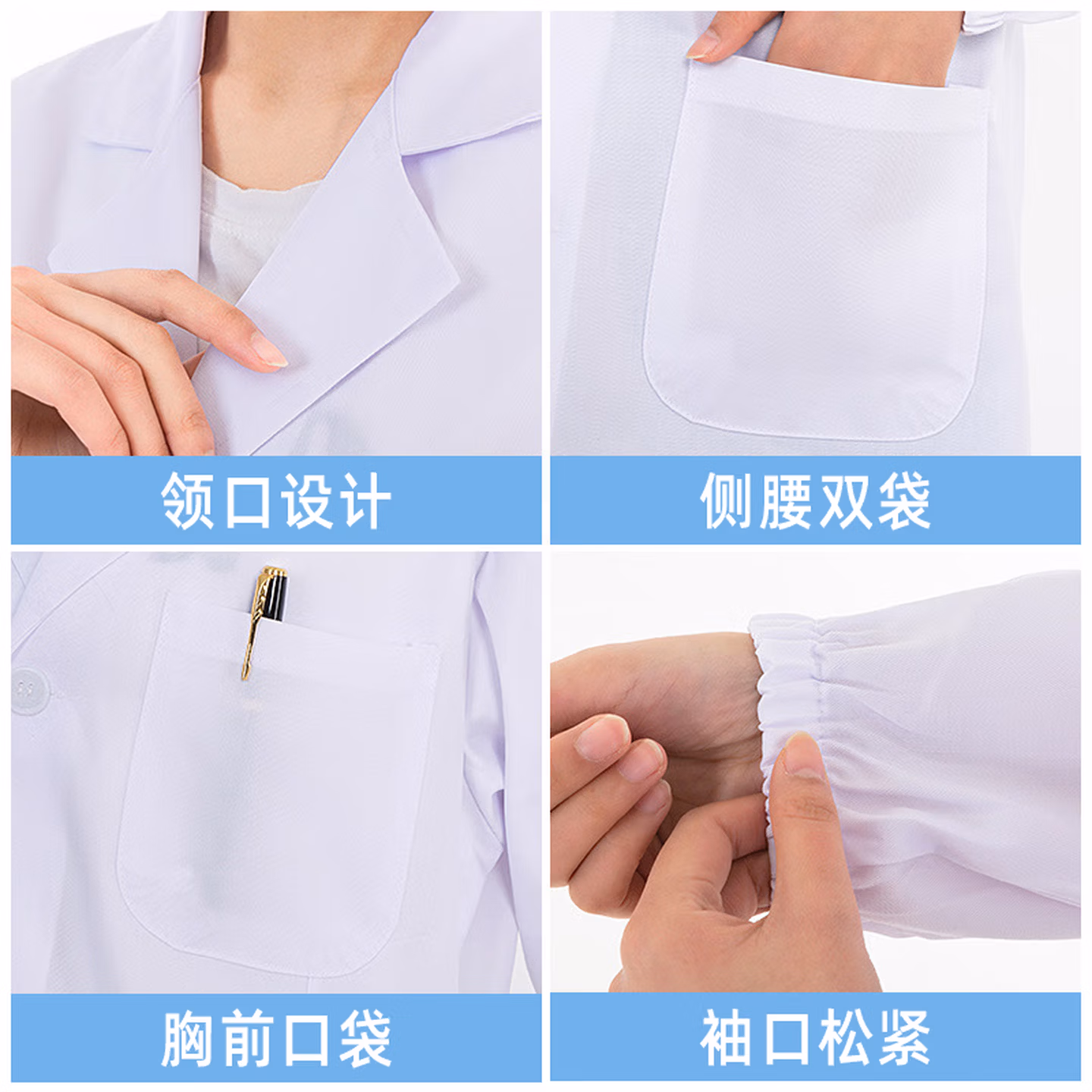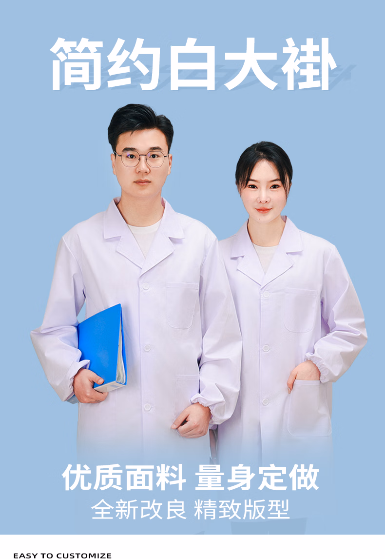 元棉长袖白大褂 松紧袖口四季标准款 男女学生实验室工作服可定制 XL码