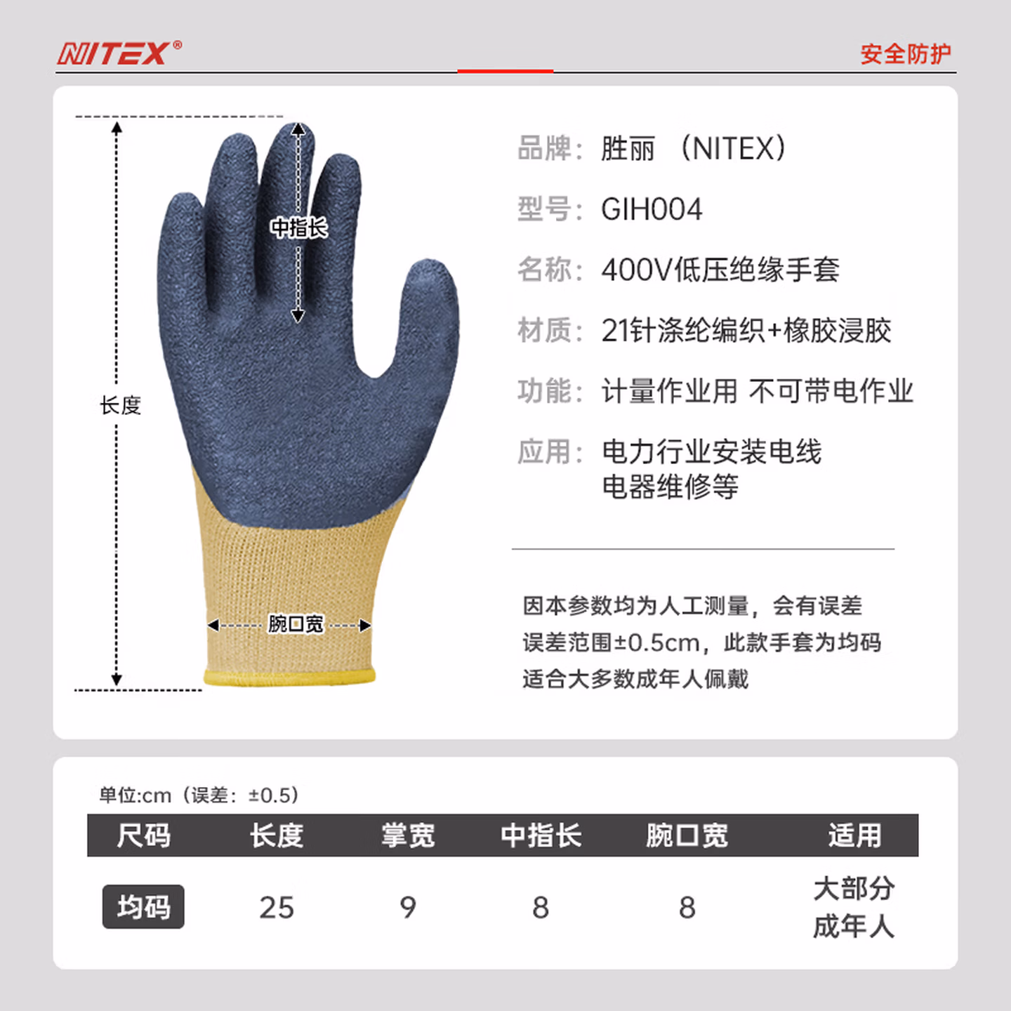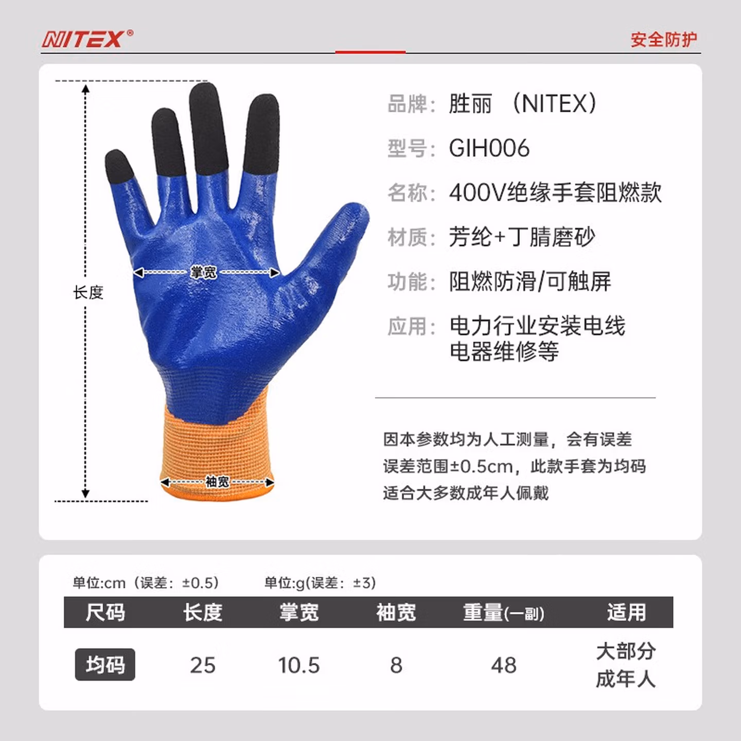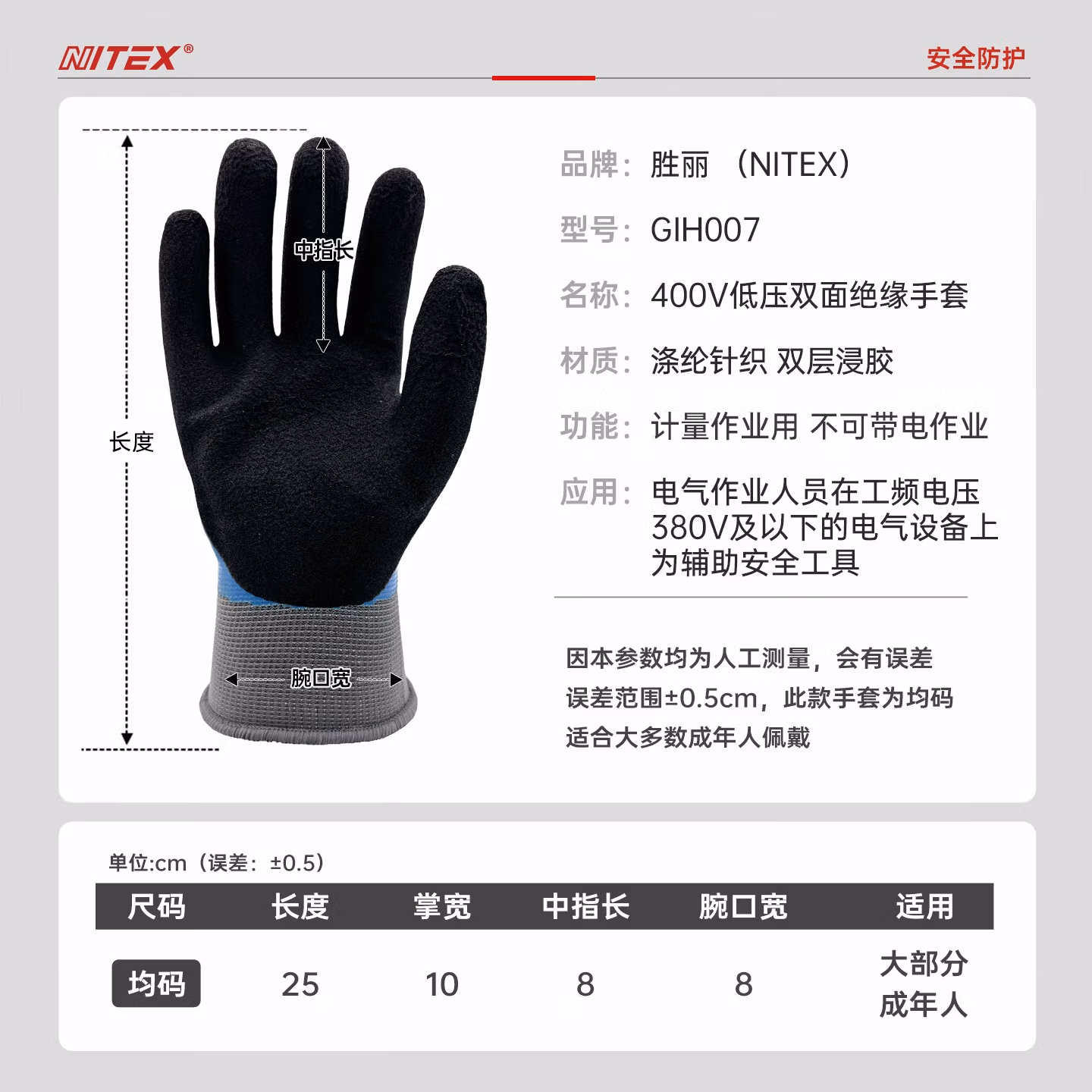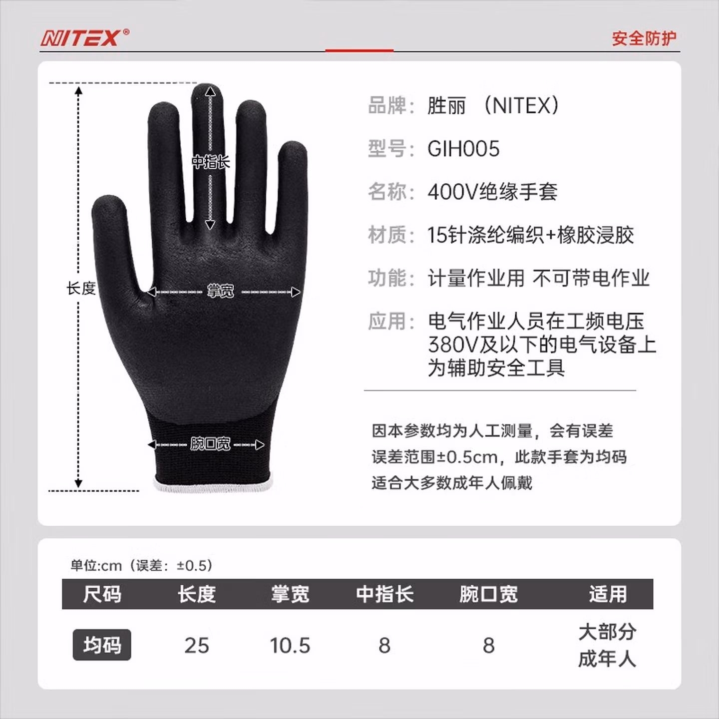 胜丽 NITEX®绝缘手套1000V电工手套低压绝缘手套双面绝缘 电路维修配电室防电接线专用GIH008 1副