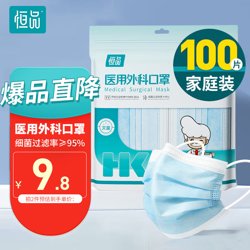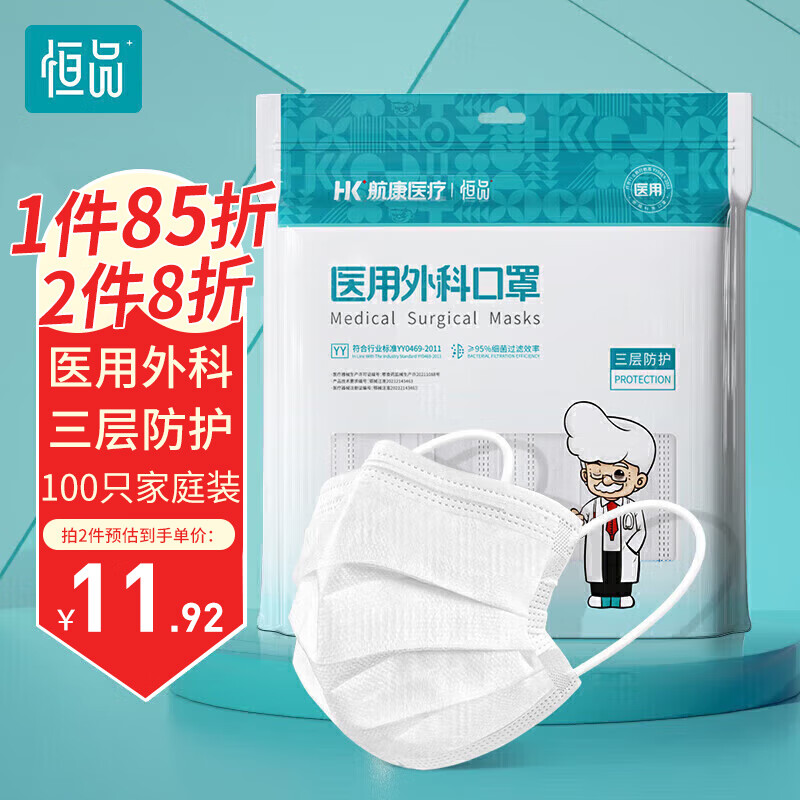 恒品一次性医用外科口罩【独立包装】成人三层防护舒适透气 100只/袋