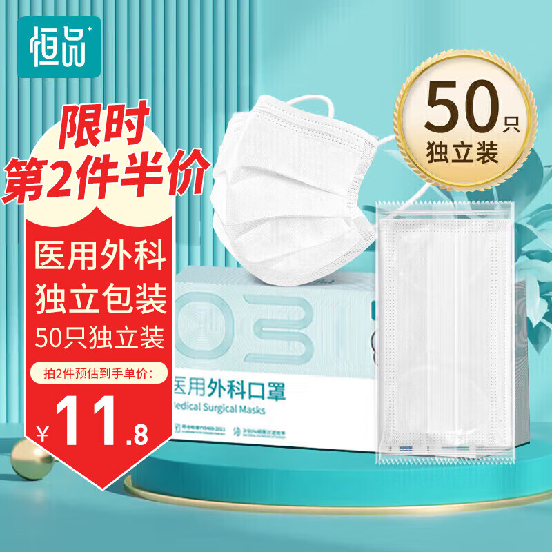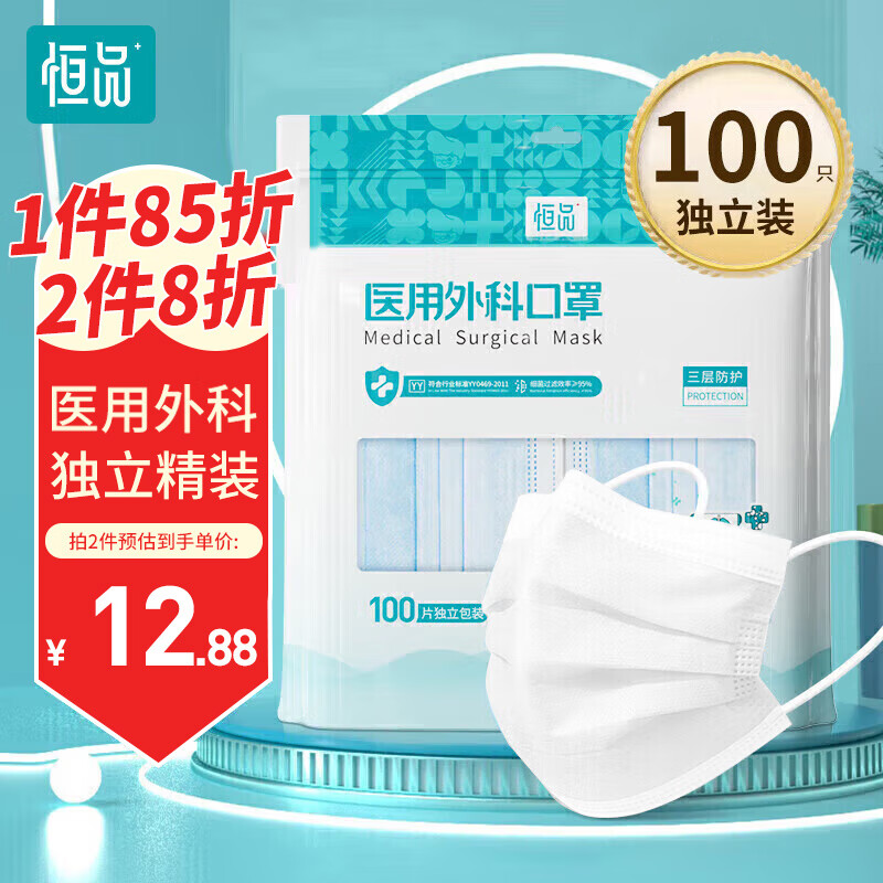 > 恒品一次性医用外科口罩【独立包装】成人三层防护舒适透气 100只/袋
