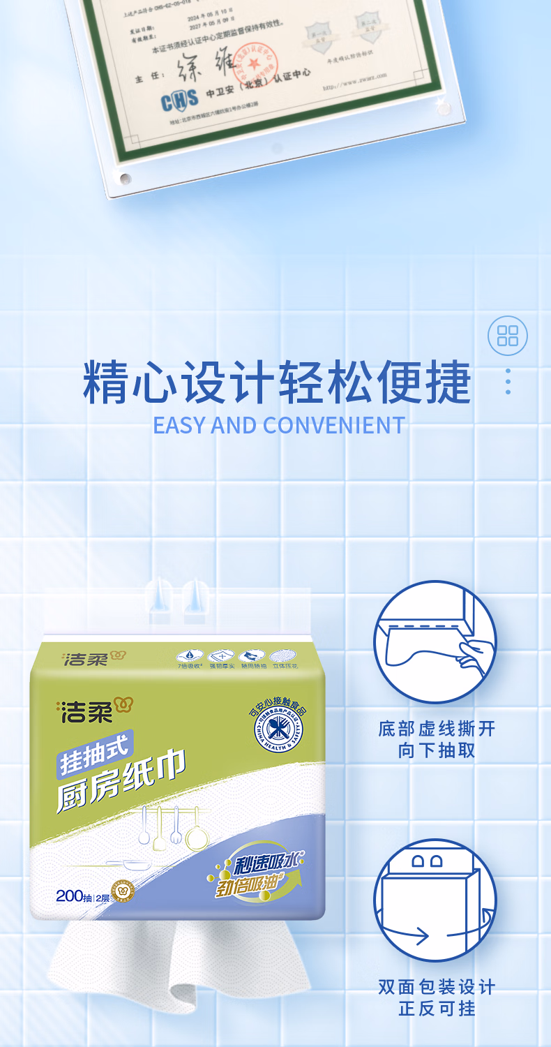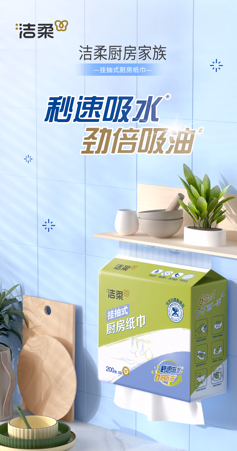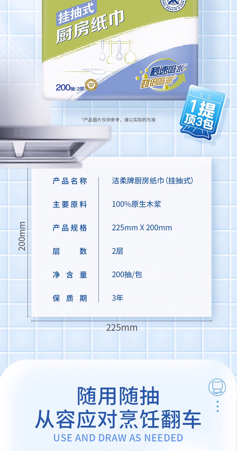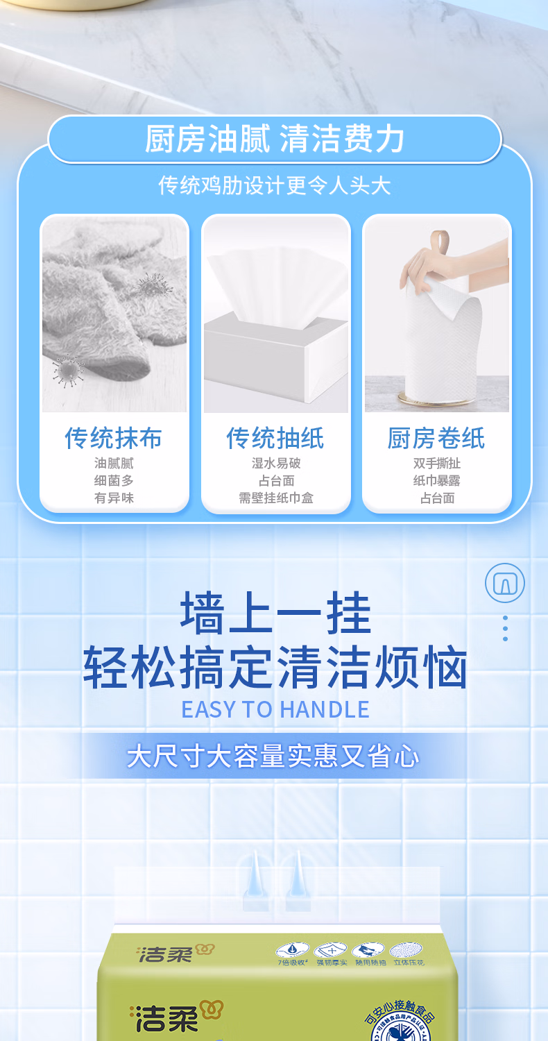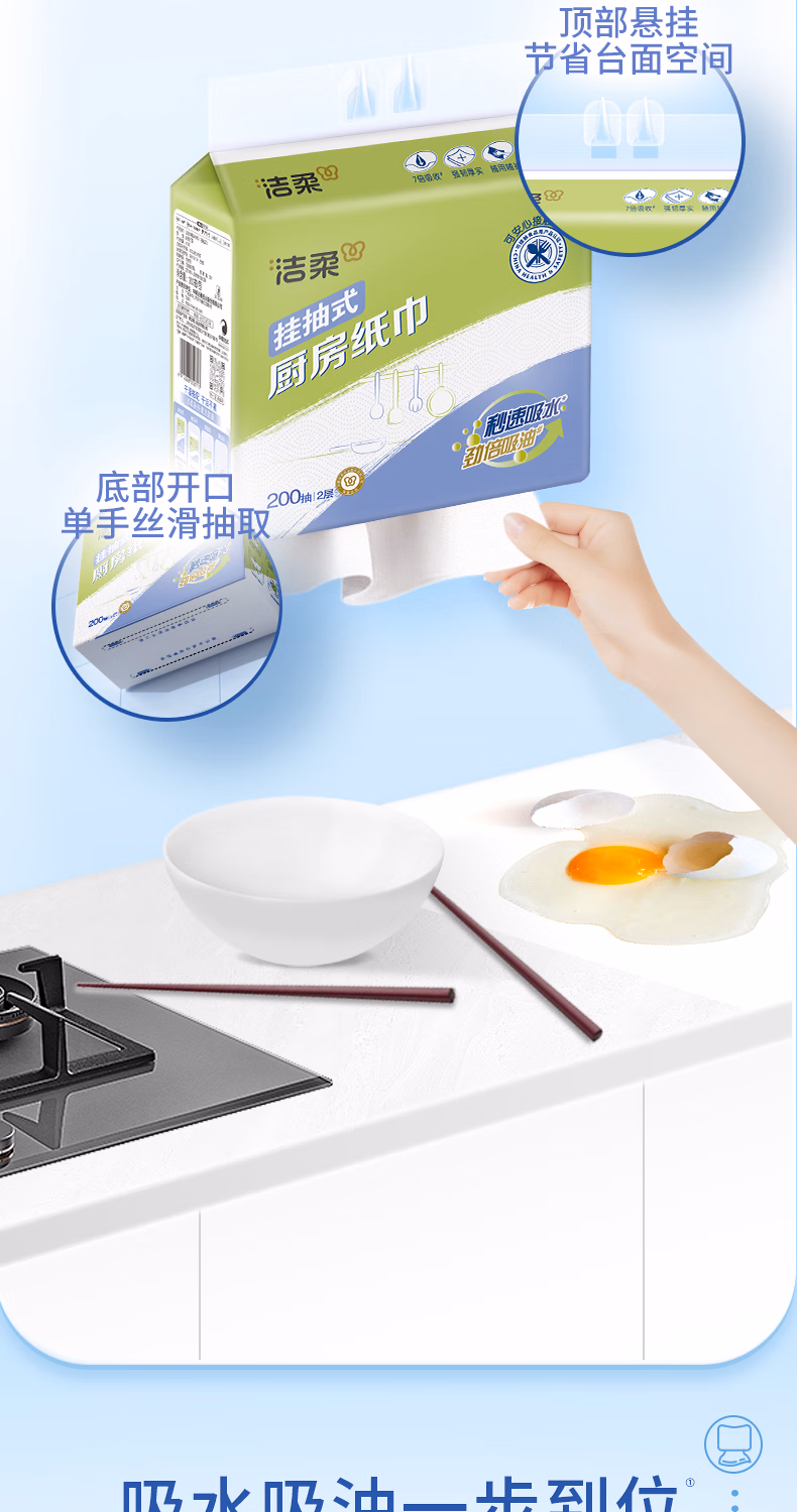 > 洁柔厨房抽纸200抽*4包新年清洁吸水吸油一次性懒人抹布大包悬挂式