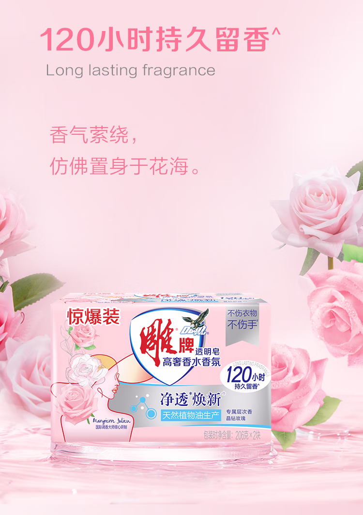 > 雕牌 高奢香水香氛透明皂 玫瑰香 206g*2块*24组 有效除菌 持久留香