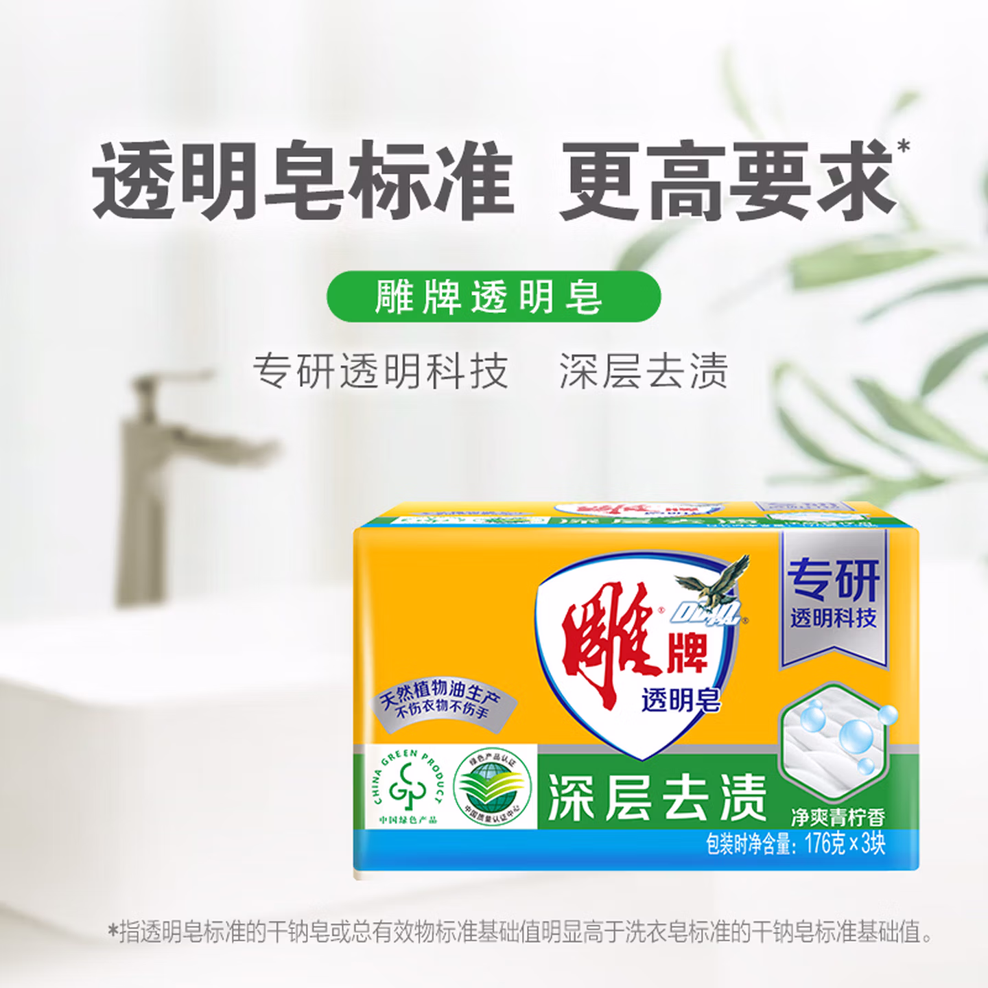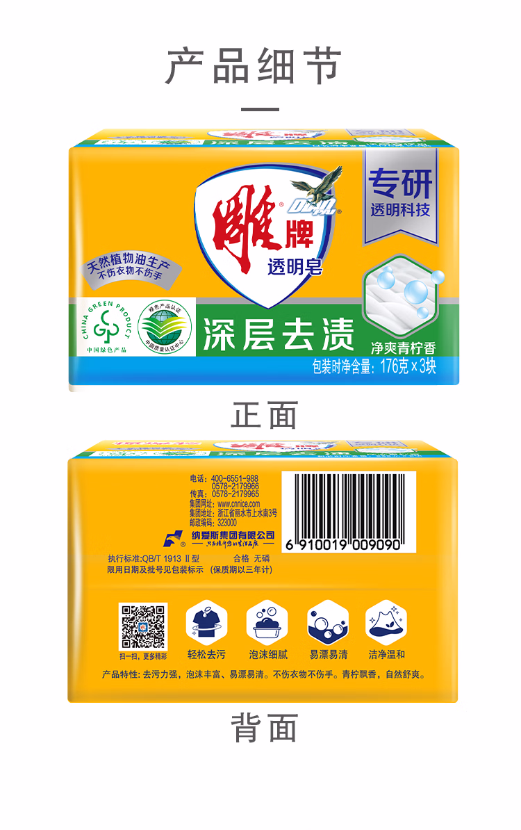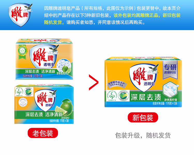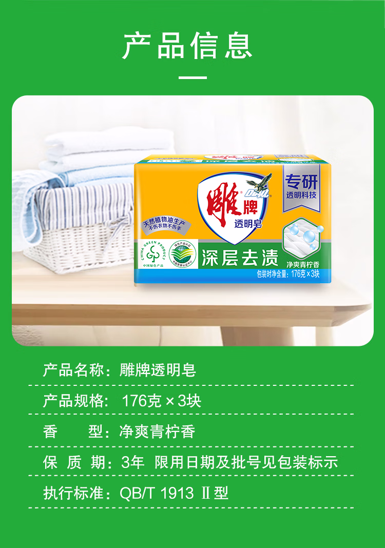> 雕牌 透明皂 净爽青柠香 176g*3块 深层去渍 轻松去污 易漂易清