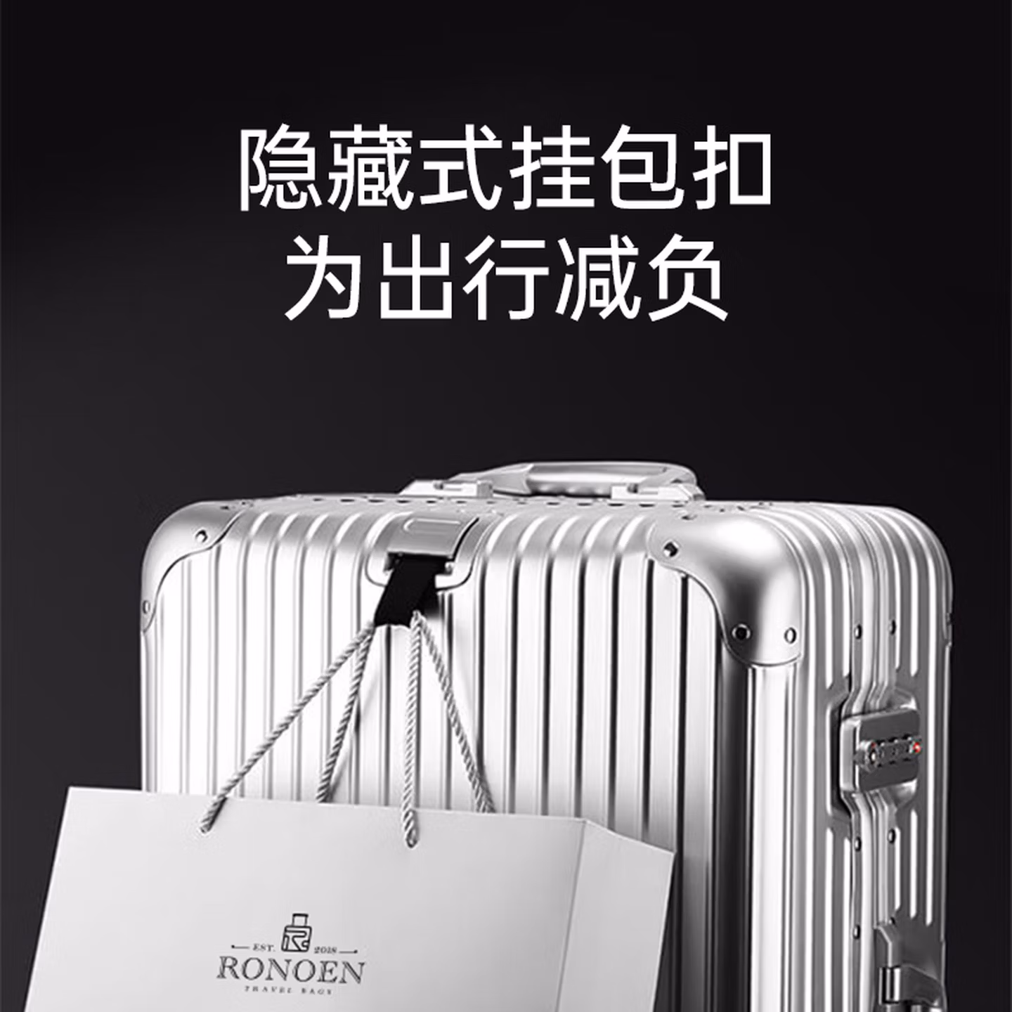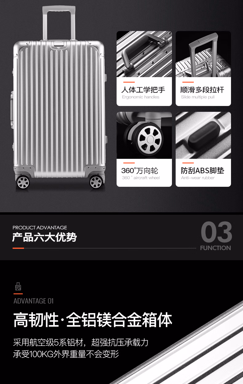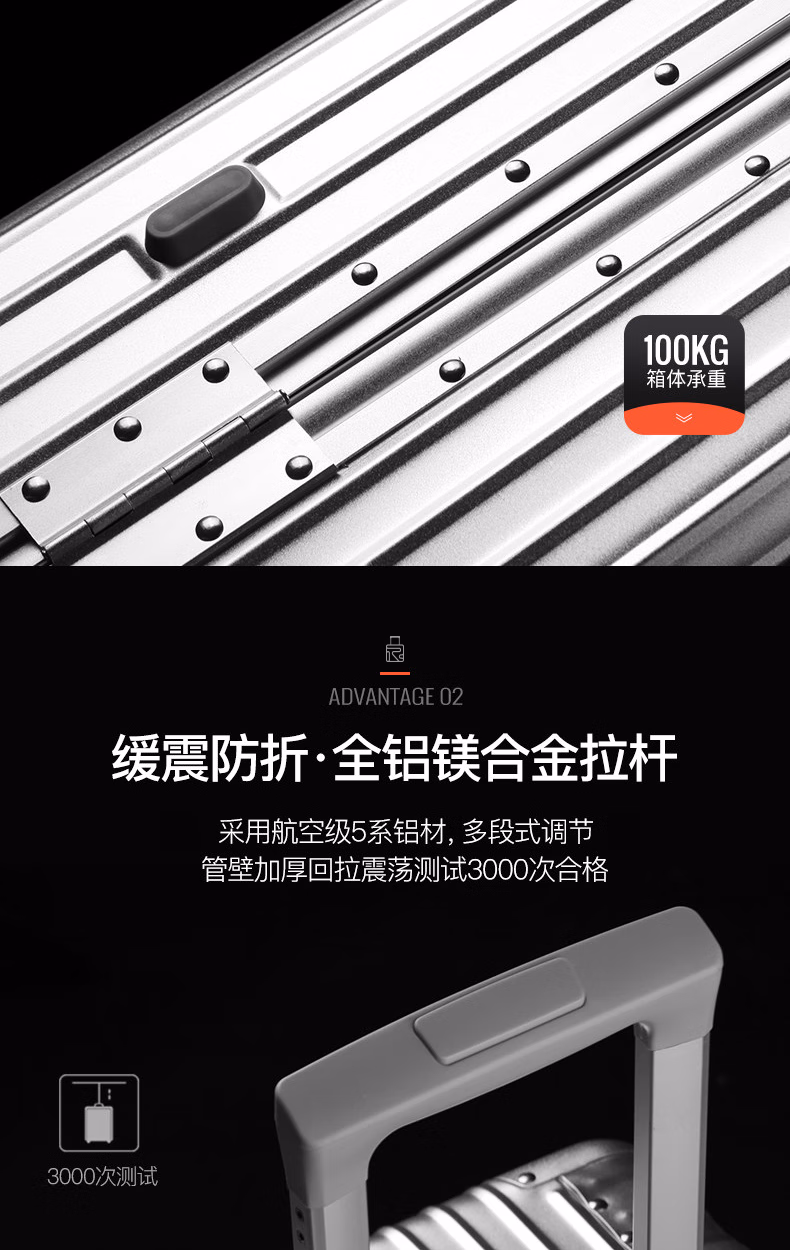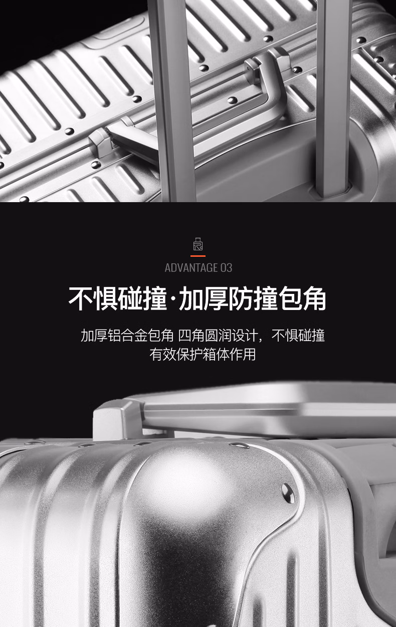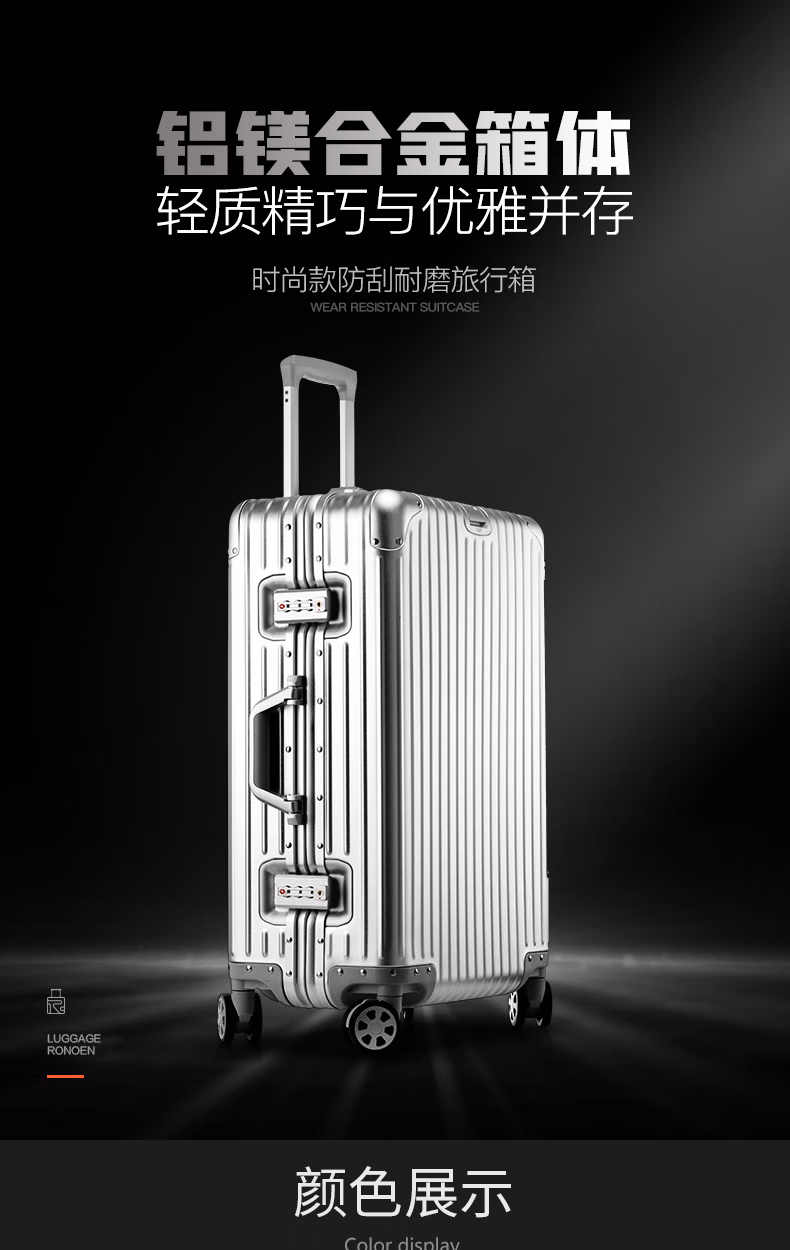 > 罗恩(Ronoen)全铝镁合金行李箱金属男铝框拉杆箱万向轮登机箱大旅行箱包小箱子 银色 20英寸 【可登机-铝镁合金】