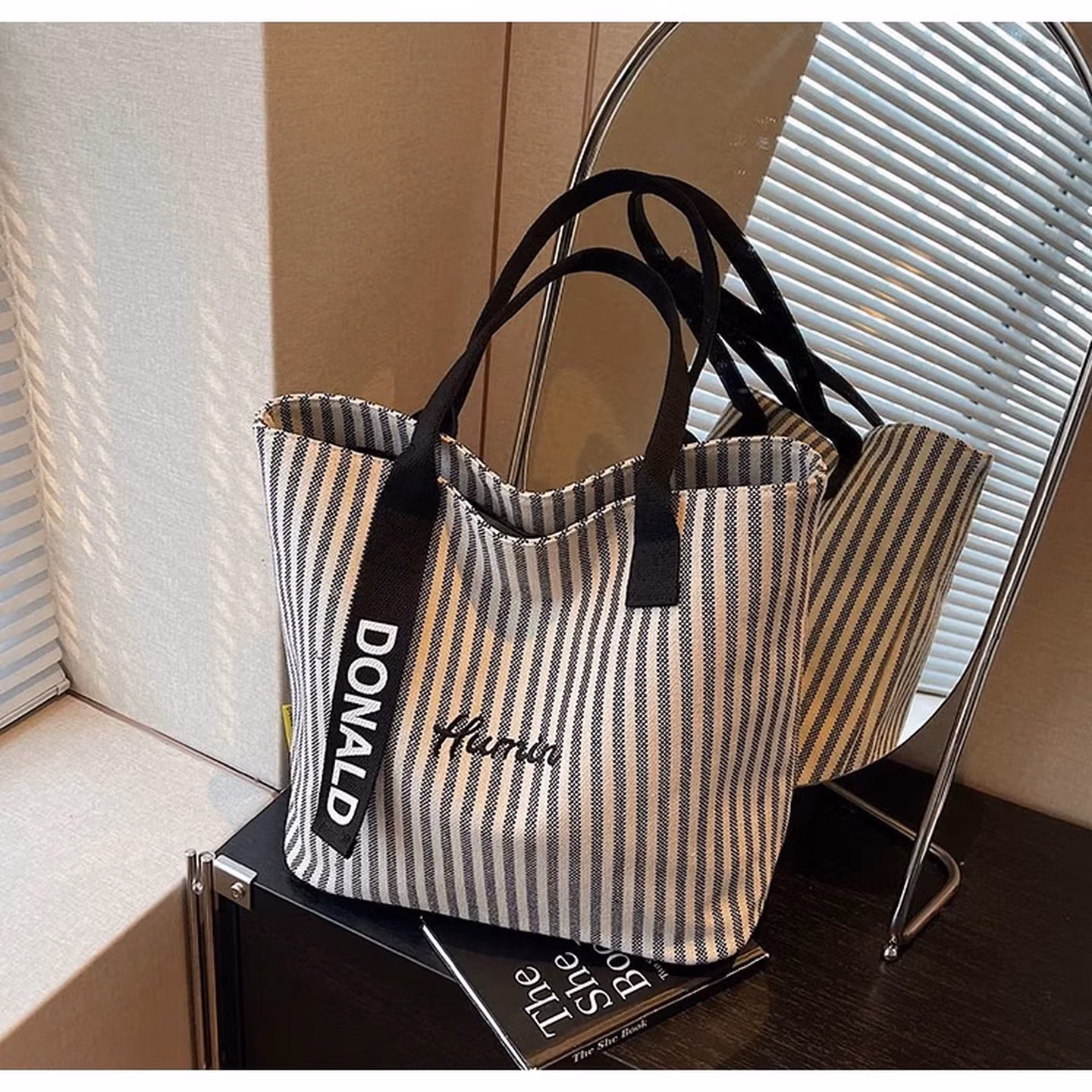科尔洛克条纹大容量帆布包包女2025新款时尚手提单肩购物袋休闲通勤托特包